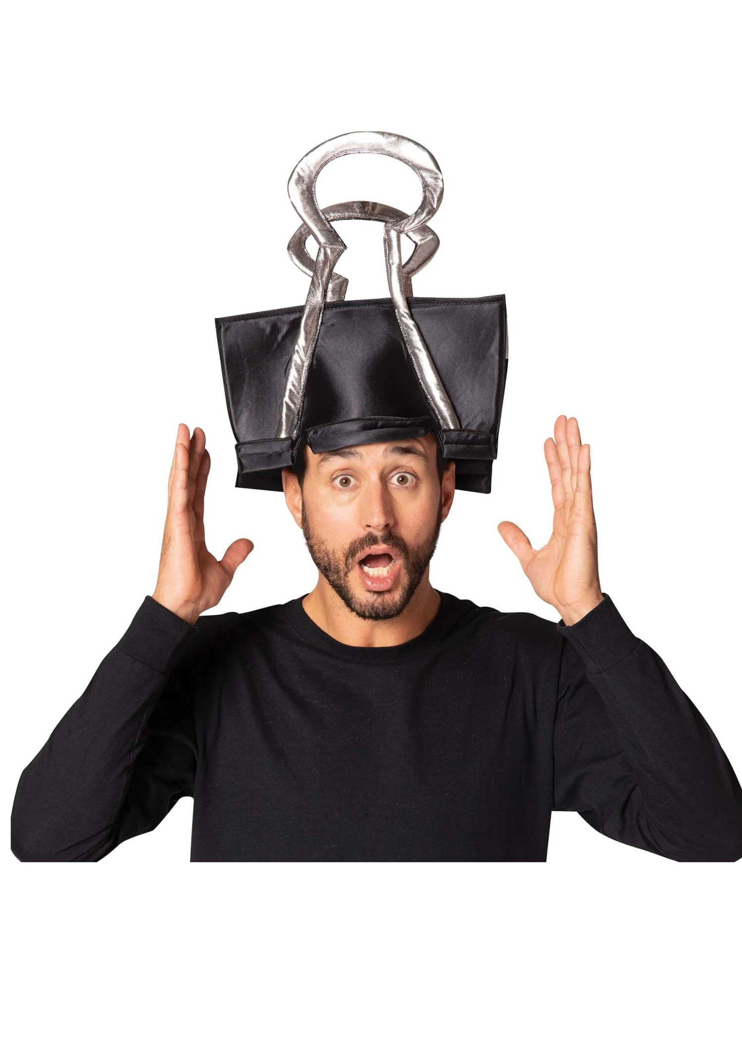 Be the tidiest person at the costume party by wearing this Adult Binder Clip Hat! The fabric hat is shaped like a black clip, with silver-tone fabric “wire” detail sticking up from the front and back. Fortunately, this clip doesn’t squeeze your head the way a real one would. It’s very comfortable to wear.