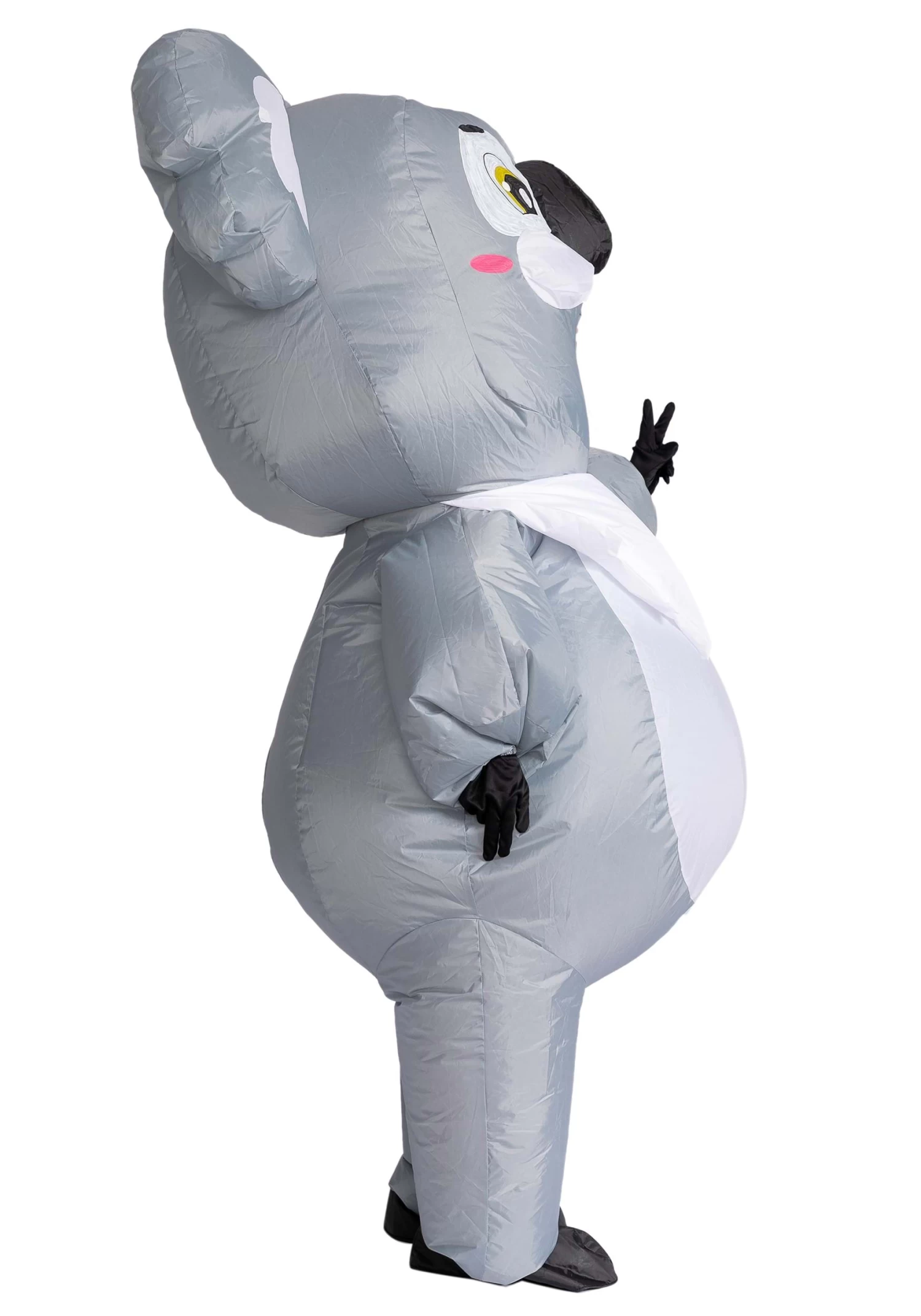 The costume only takes a few minutes to inflate, and has a grey and white exterior inspired by the classic Koalas! Once inflated, you leave the fan on while you enjoy the costume. The head has a generous opening for your face, but still creates an airtight seal with elastic.