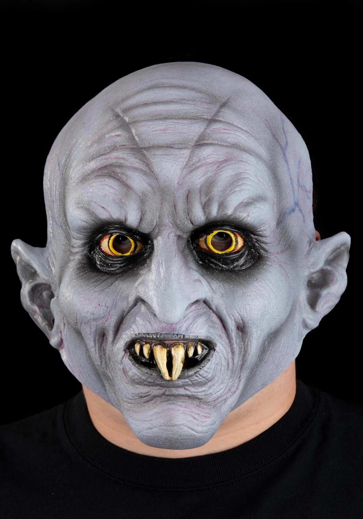 Emerge from your coffin in style wearing this Adult Nosferatu Vampire Full Face Mask! The mask covers your entire face and is molded to look like a leering, hairless vampire. Its mouth is open in an evil smile, baring yellowed fangs that dangle over its bottom lip. Its pupils are also yellow and its skin is a haunting purplish gray.