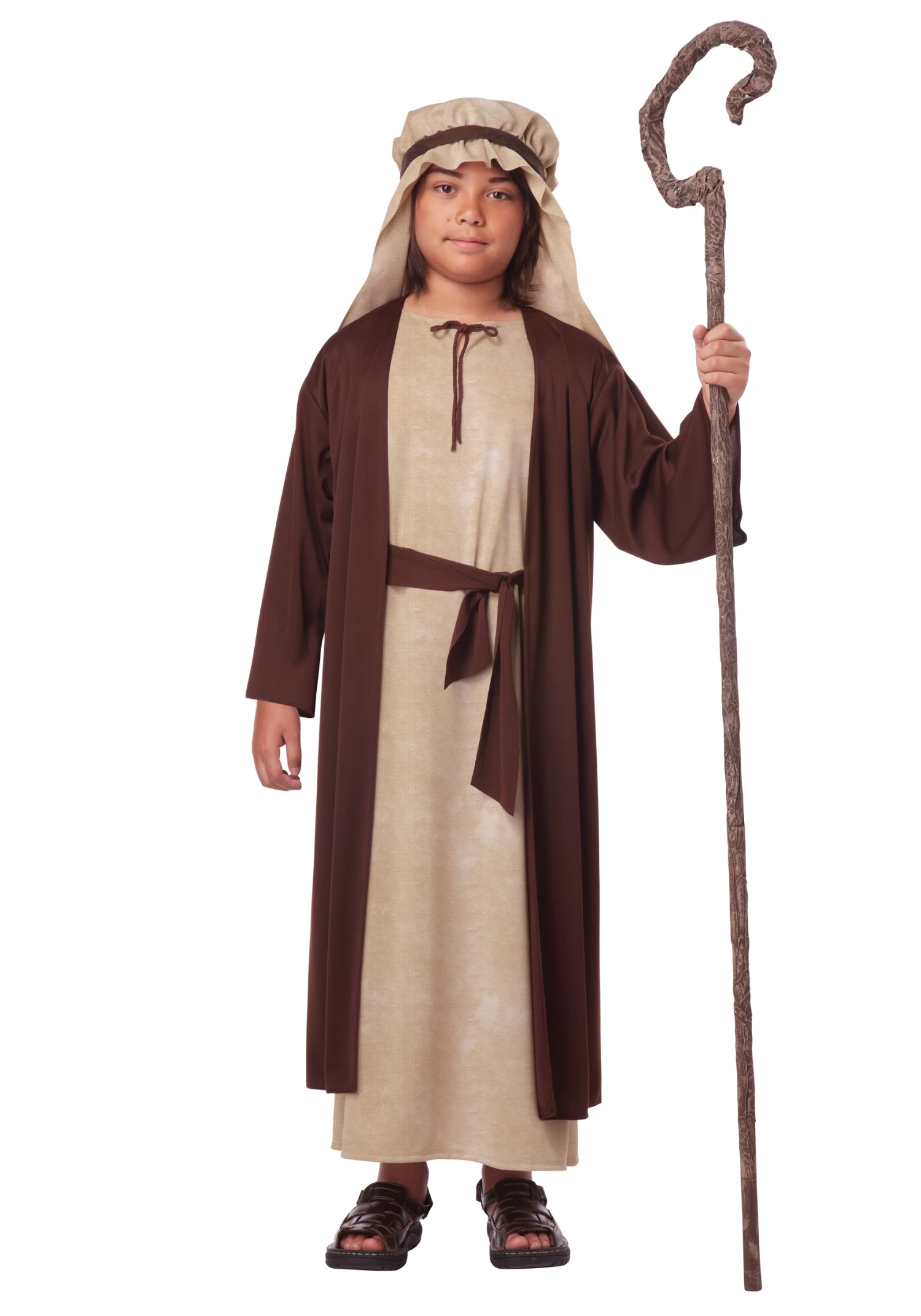 It’s a 100% polyester tan robe that has ties by the collar. The brown overcoat is attached to the robe and ties around the waist. Included with this costume is a headpiece that is stretchy and ties around the head. Not included, but something you’ll want to add to this, is a good pair of sandals and a shepherd’s crook. Be sure to check our accessories store for both of these!