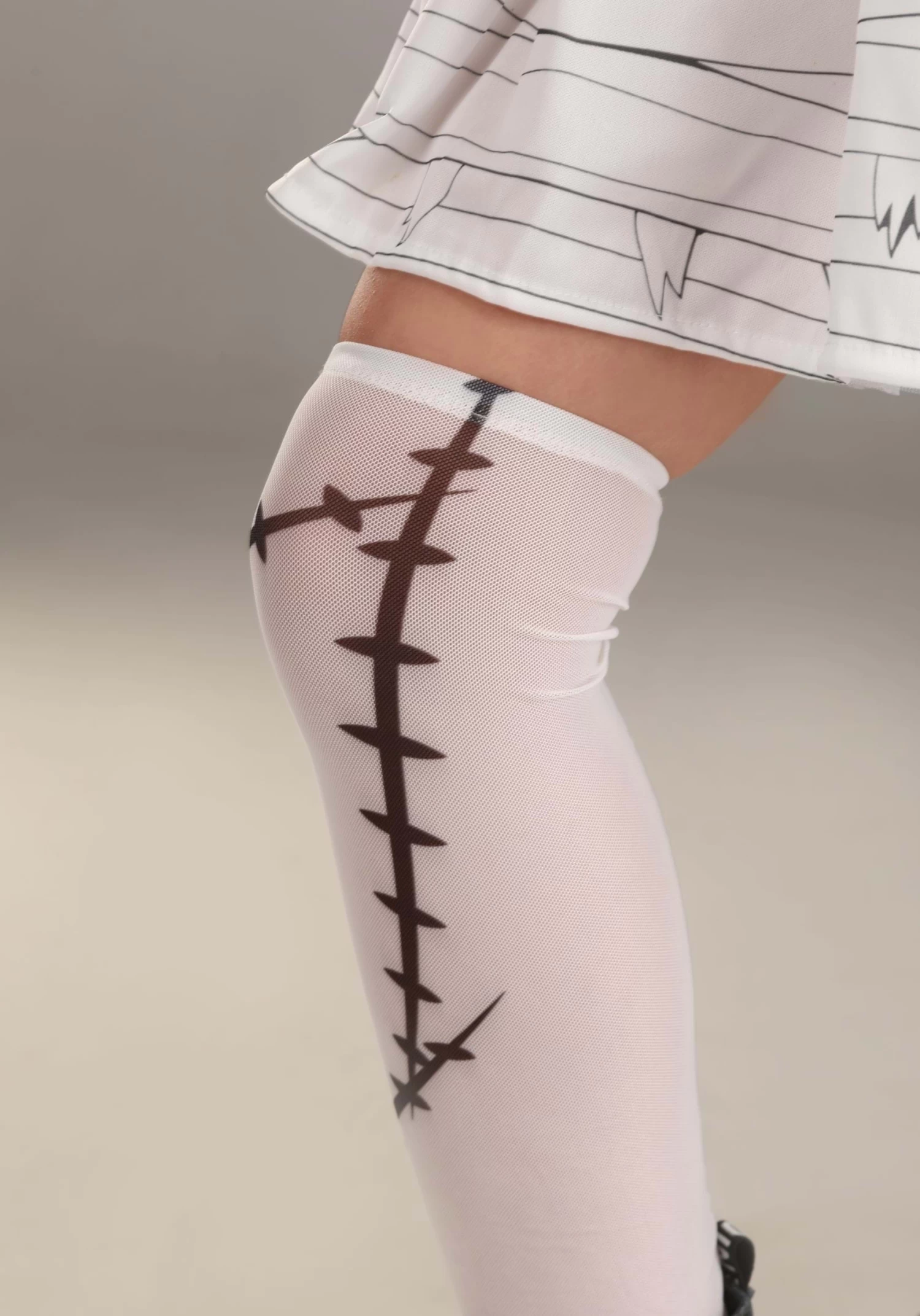 Become Dr. Frankenstein’s new and improved lab project when you wear this exclusive Bride of Frankenstein Costume Dress for Kids! The minidress zips up the back and is made of soft white fabric. Its bodice has a sheer neckline that matches the sheer sleeves, and is printed all over with black stitch graphics. The intentionally jagged pannier-style overskirt is also has printed stitch details, while the underskirt is decorated with a pattern of tattered bandages. The semi-sheer white leg warmers have more printed stitch graphics.