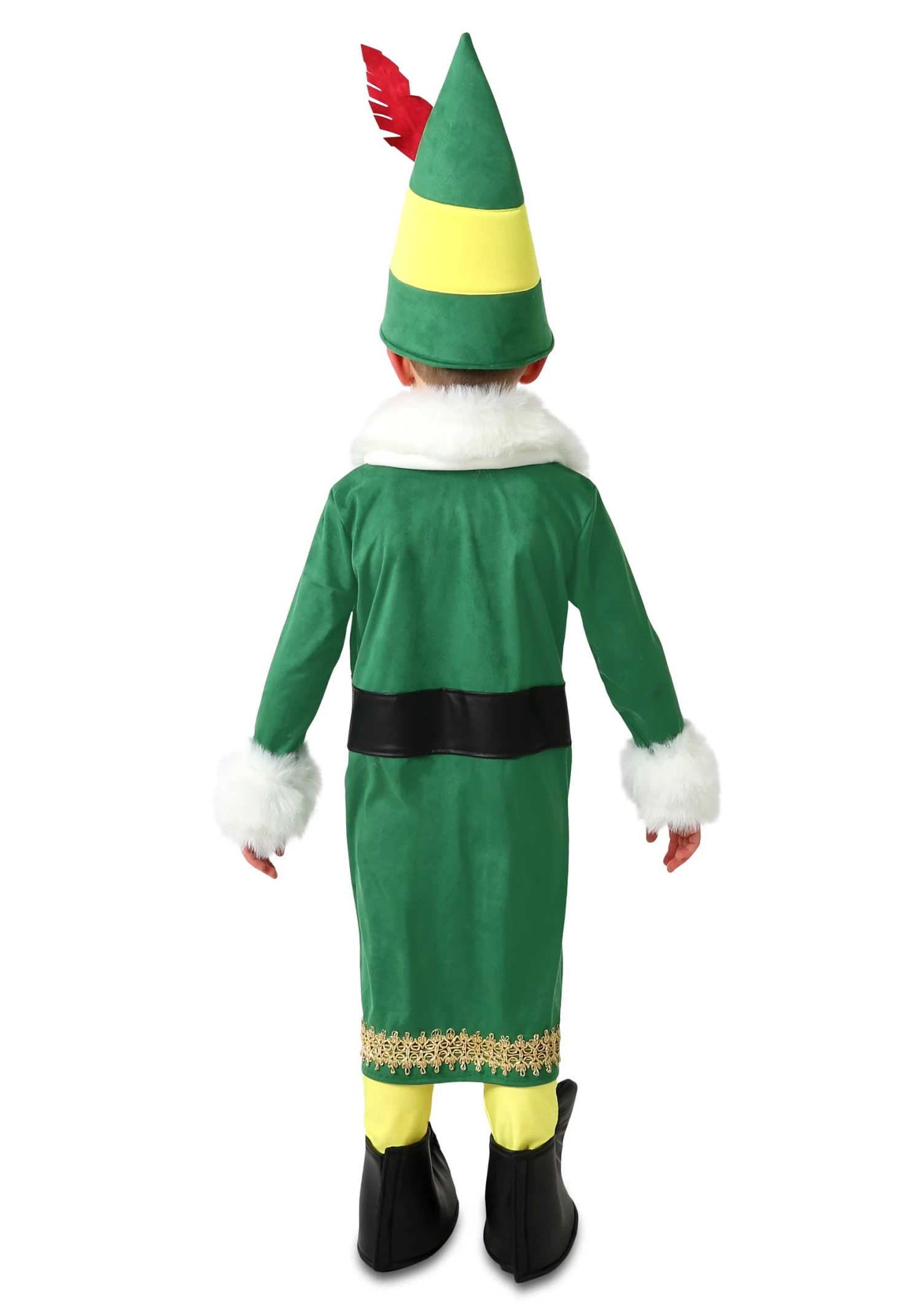 This Buddy the Elf Costume is a kid-sized version of the outfit worn by Buddy! It starts with the emerald green elf jacket. The included pants are bright yellow and feature an elastic waistband for a comfortable fit. The belt is a simple hook-and-loop fastener. That hat will truly let your little one get into character, since it’s that classic pointy style that Christmas elves are known for. To top it all off, the costume comes with a feather stuck in the hat and foam shoe covers to tie it all together!
