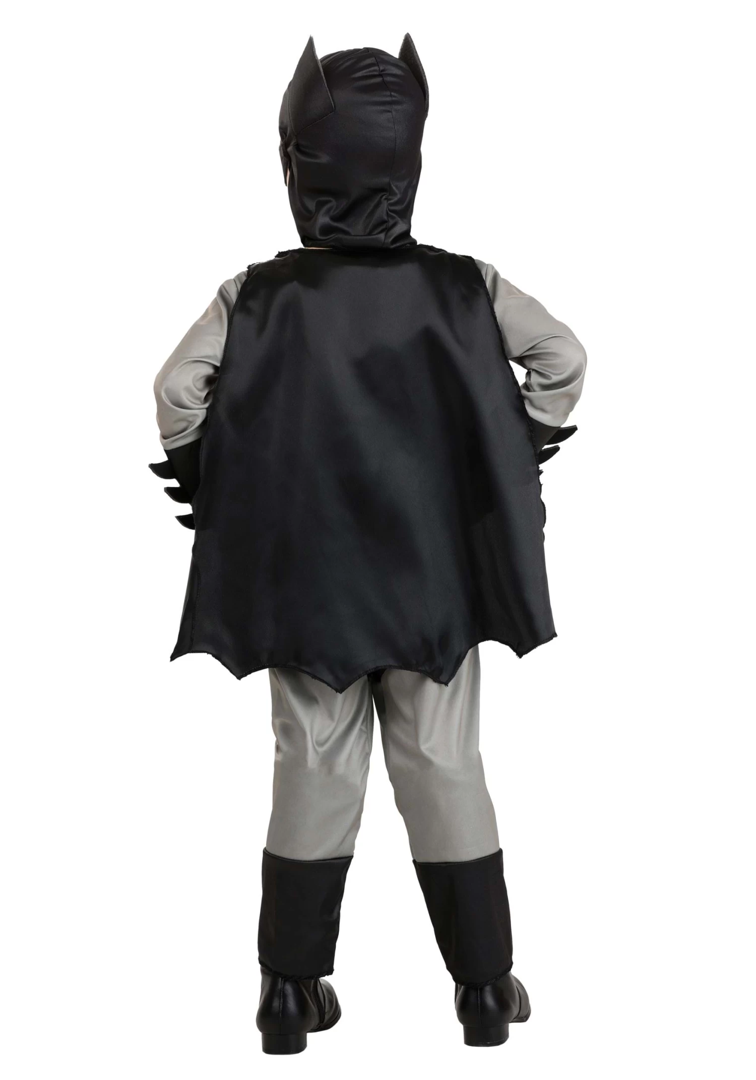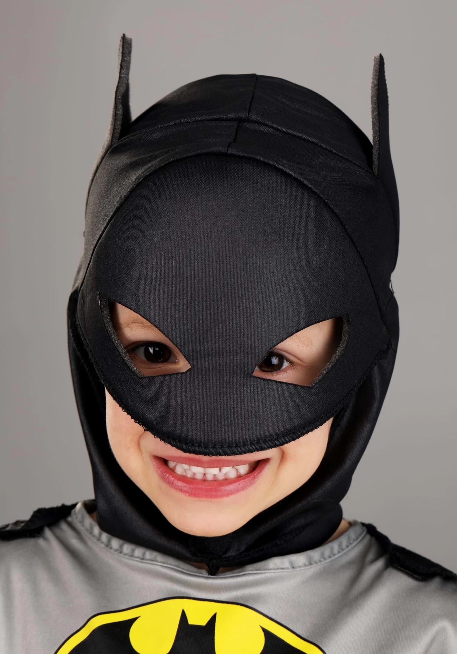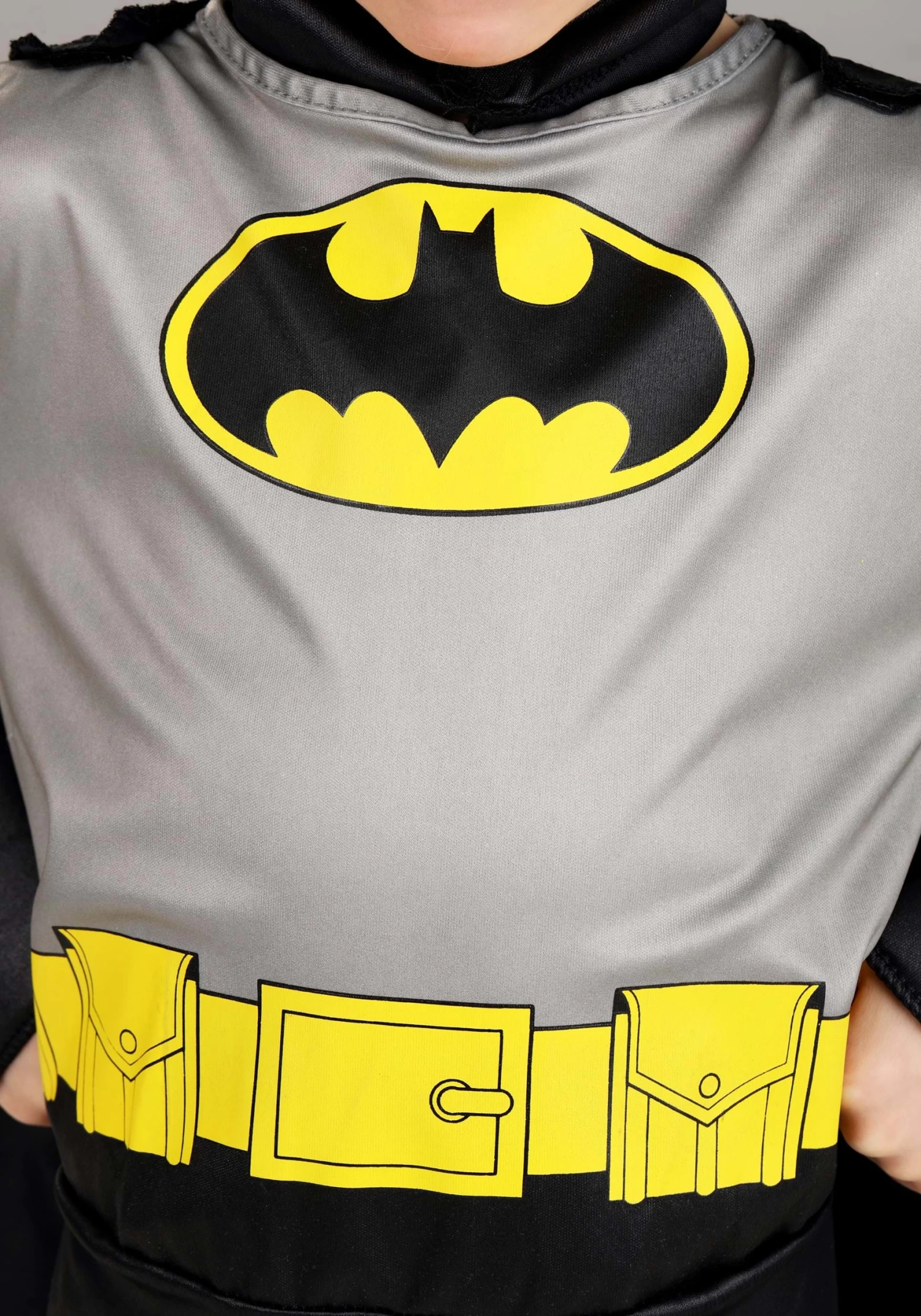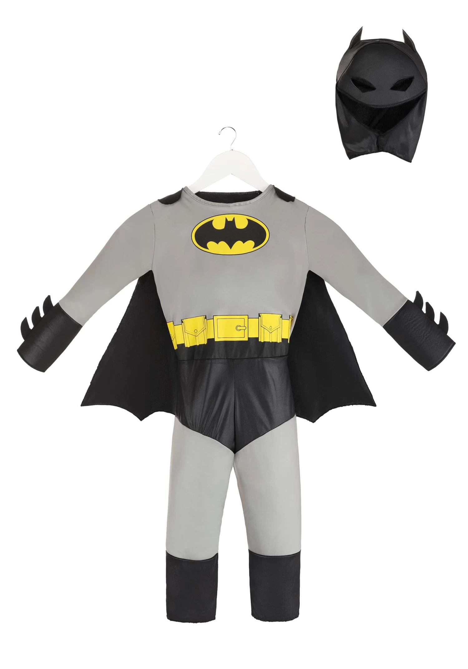 Set your toddler loose to defend good and defeat evil in this officially licensed Classic Toddler Batman Costume! The grey and black jumpsuit zips up the back so that your little hero doesn’t have to waste any time suiting up to fight crime. It looks like the Batman suits of a nostalgic era, with printed-on black shorts, spiked cuffs, and the classic Batman logo on the chest. An attached cape flutters dramatically from the shoulders. The accompanying hood with attached bat ears slips on over the head and includes a mask around the eye area to protect your toddler’s secret identity.