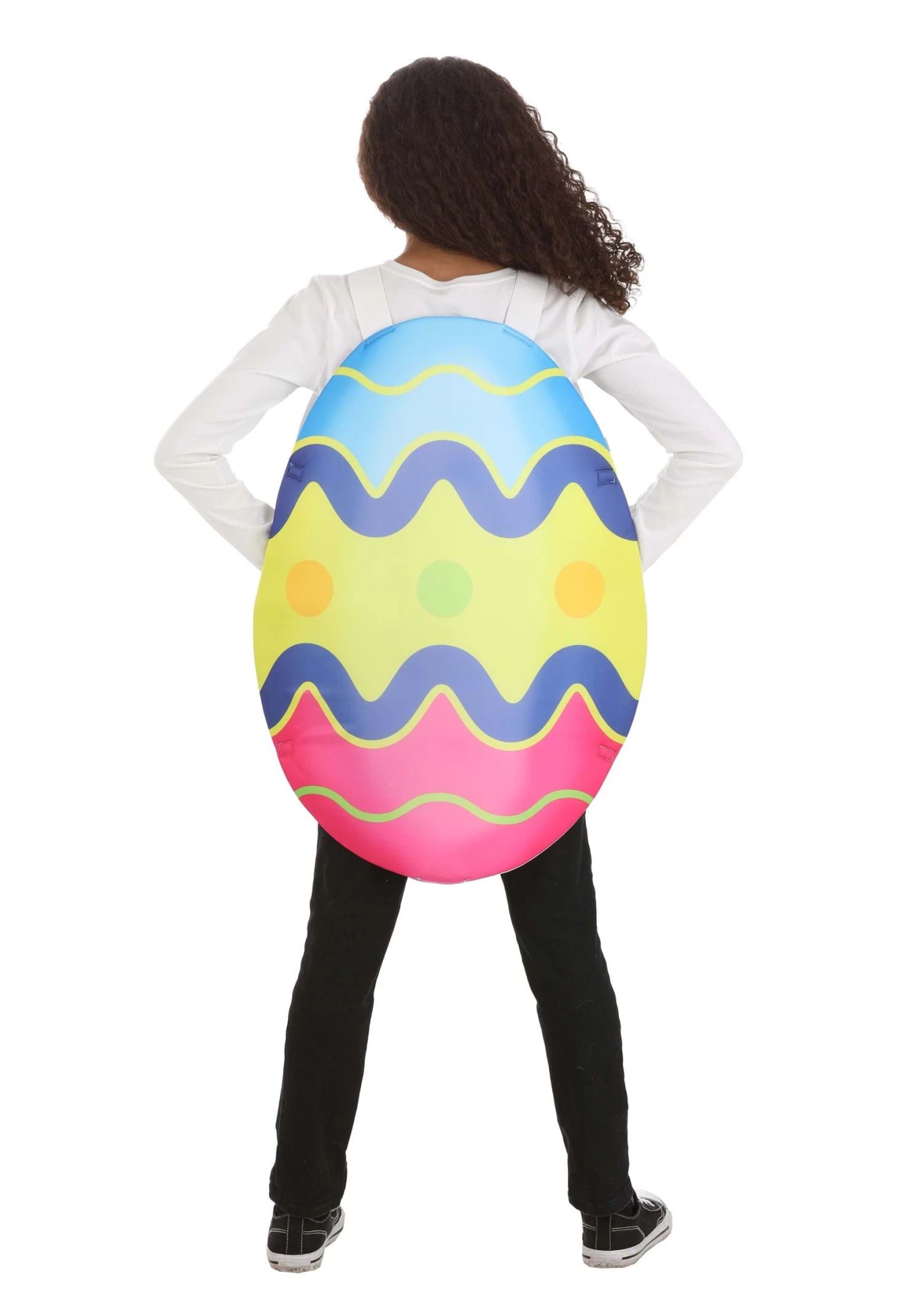 Don’t let us egg you on: Try out this exclusive Colorful Easter Egg Costume for Kids for yourself and see how much fun it is to wear! The unisex sandwich board tunic is attached at the shoulders with elastic straps and has matching side straps sewn to the front panel that secure to the back panel via hook and loop fastener strips. The egg-shaped panels are printed all over with vivid squiggles, polka dots and colorblocking. Each one is backed with foam to help it keep its shape.