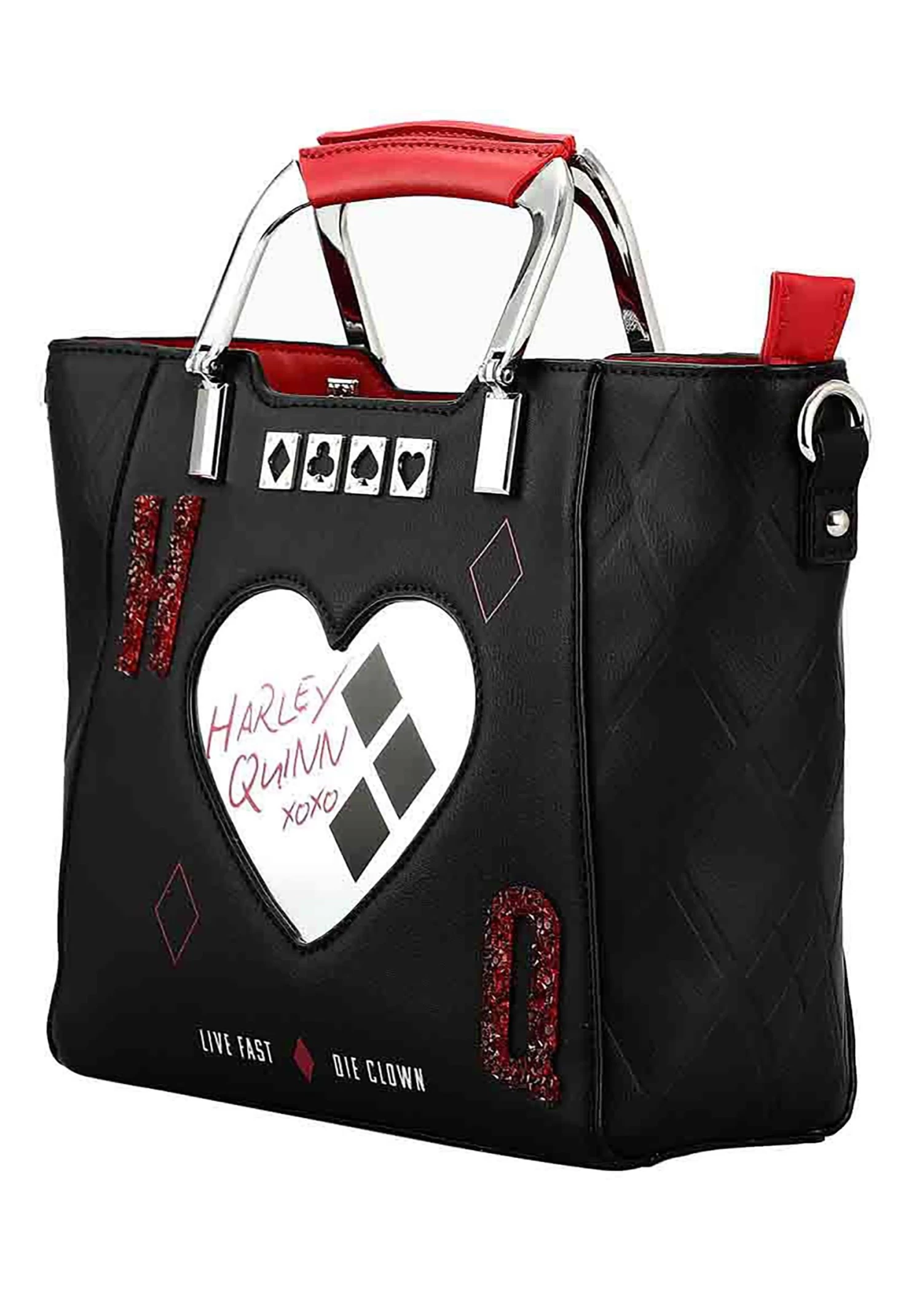 - Faux leather outer shell has DC Comics Harley Quinn Suicide Squad Metallic Heart, and jeweled H, & Q and metal charms attached