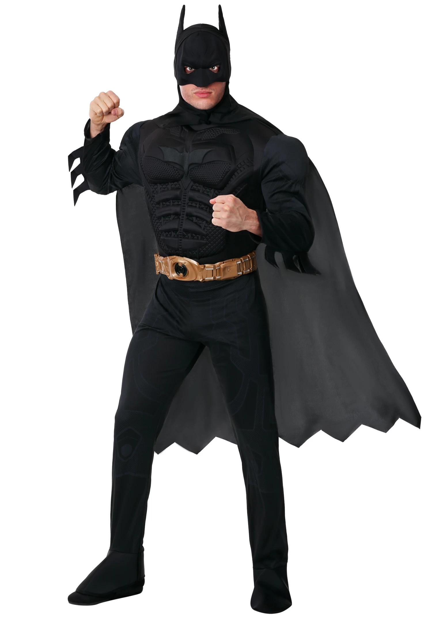 This Dark Knight costume ensemble is styled as black polyester jumpsuit with a molded foam chest and arms for a truly muscular appearance. It features attached boot tops, shoulder padding, and ridged sleeves. A matching black headpiece features a molded facemask and an attached cape. A gold molded rubber utility belt wraps around the waist and secures with ties in the back. And, it’s DC Comics officially licensed from the smash hit Dark Knight trilogy