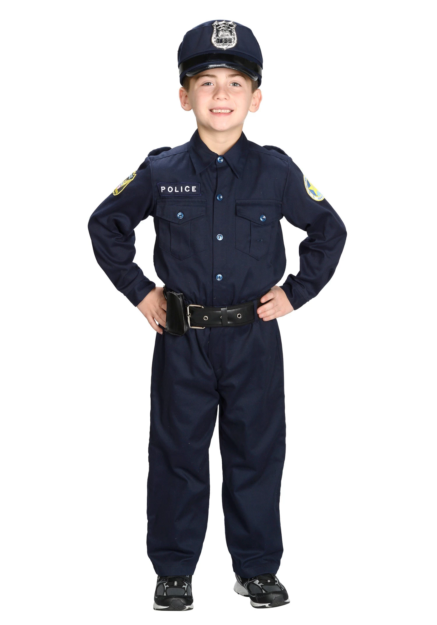 Help your kiddo realize their law enforcement dreams with this Deluxe Police Officer costume. This ensemble includes a navy blue jumpsuit styled after the iconic police uniform, plus a hat and a belt. The jumper says “Police” on the front and has a patch on the sleeve. The hat features the police badge and is adjustable and the realistic-looking belt cinches the outfit together!