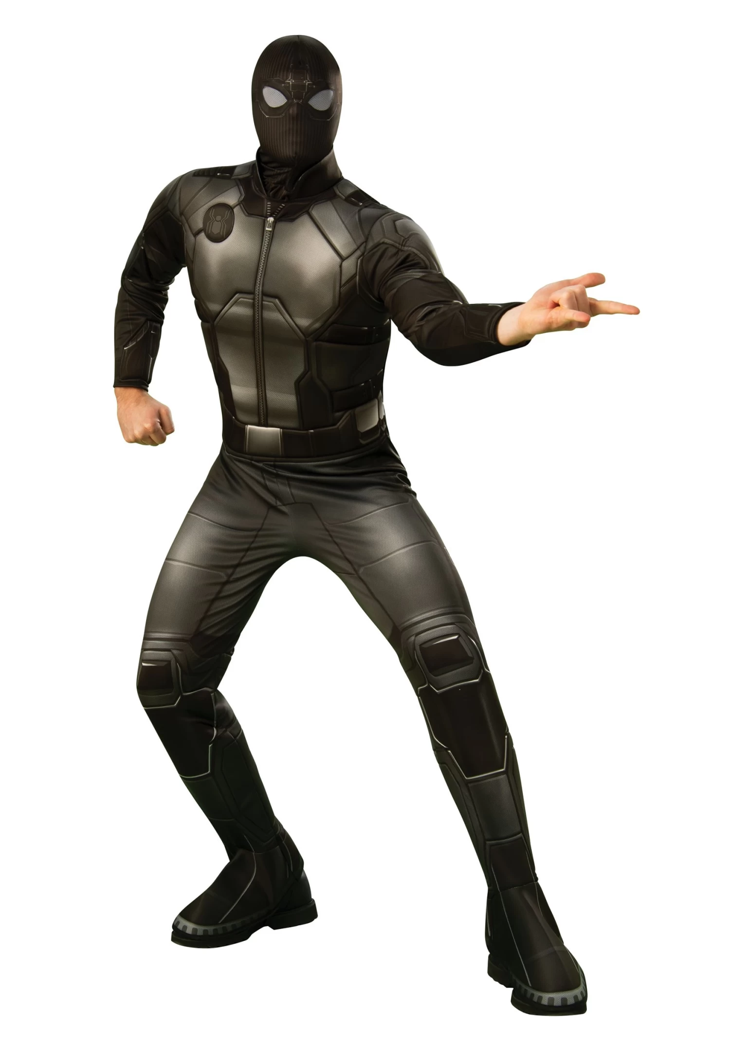 The truth is finally out. Spider-Man, for all his friendly neighborhood antics, is actually a ninja! It’s time to suit up in true style with this deluxe Black Spider-Man suit, officially licensed from Spider-Man: Far From Home. This black jumpsuit is designed to look like S.H.I.E.L.D.’s compromised offer to Peter. The suit zips up, has a tactical jacket collar, and features the Spider-Man logo on the shoulder. The mask has mesh eyes (instead of the more awkward flip-up goggles).