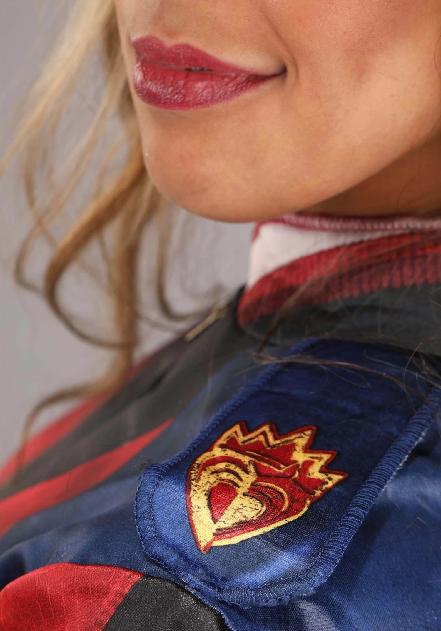 This licensed look was designed after the fabulous ensemble Evie wore when she woke Doug from his enchanted slumber with true love’s kiss. The color block ensemble features a long jacket with faux zippers and a crowned heart on the back. Securing with hook and loop fasteners up the back, it’s easy to throw on. Soft, straight-leg pants are layered under the short skirt. Complete with gloves, this costume is ready to rule the runways of Auradon.