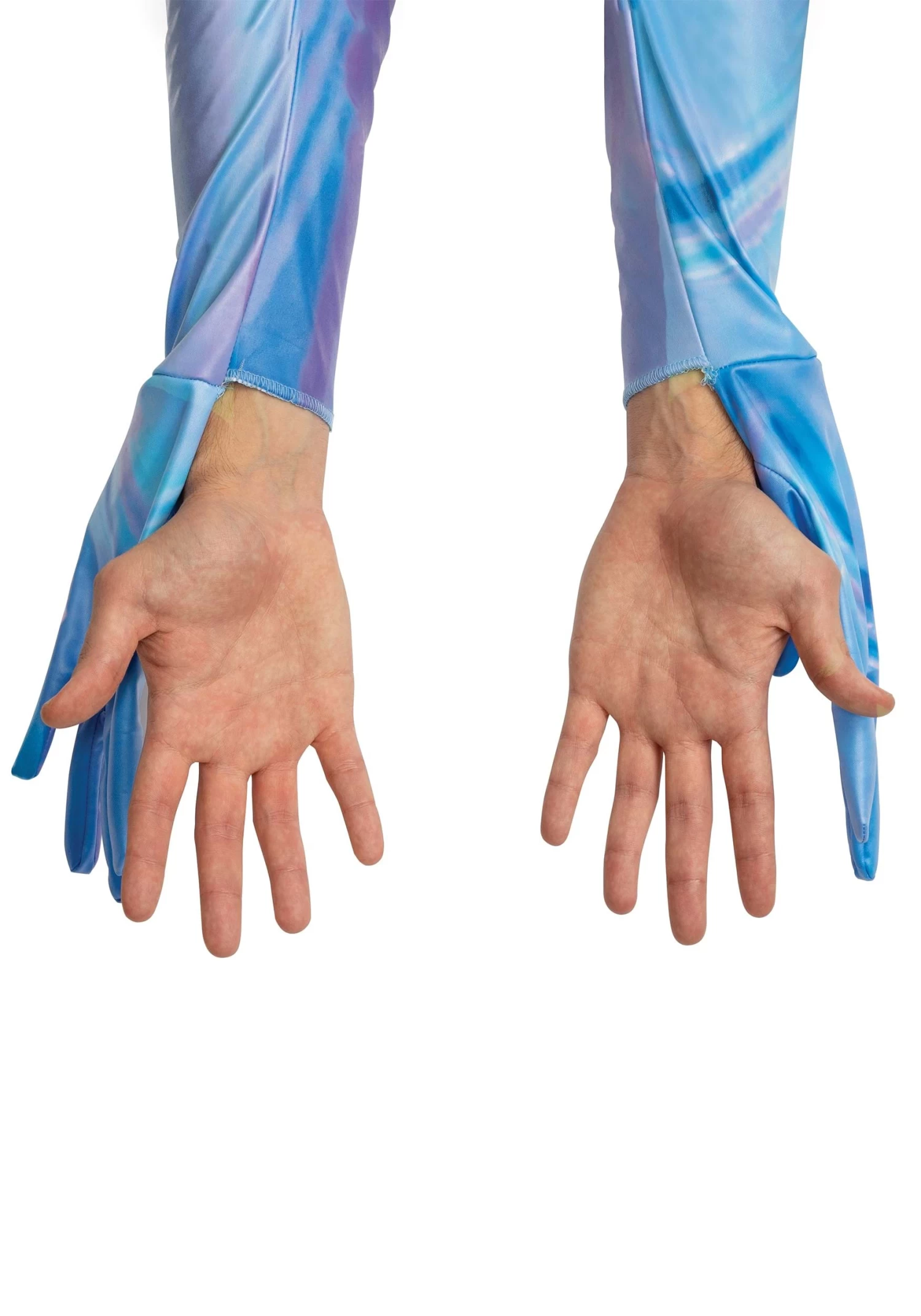 A pair of long sleeves are attached to the costume. They are designed to look like Wade’s watery blue arms. The sleeves are designed with attached gloves that can be easily taken on or off as desired. The same material the long sleeves are made of is attached to the costume around the head opening. It will cover your neck and shoulders, giving them a watery appearance. Lastly, the headpiece will give you Wade’s stylish hairdo!