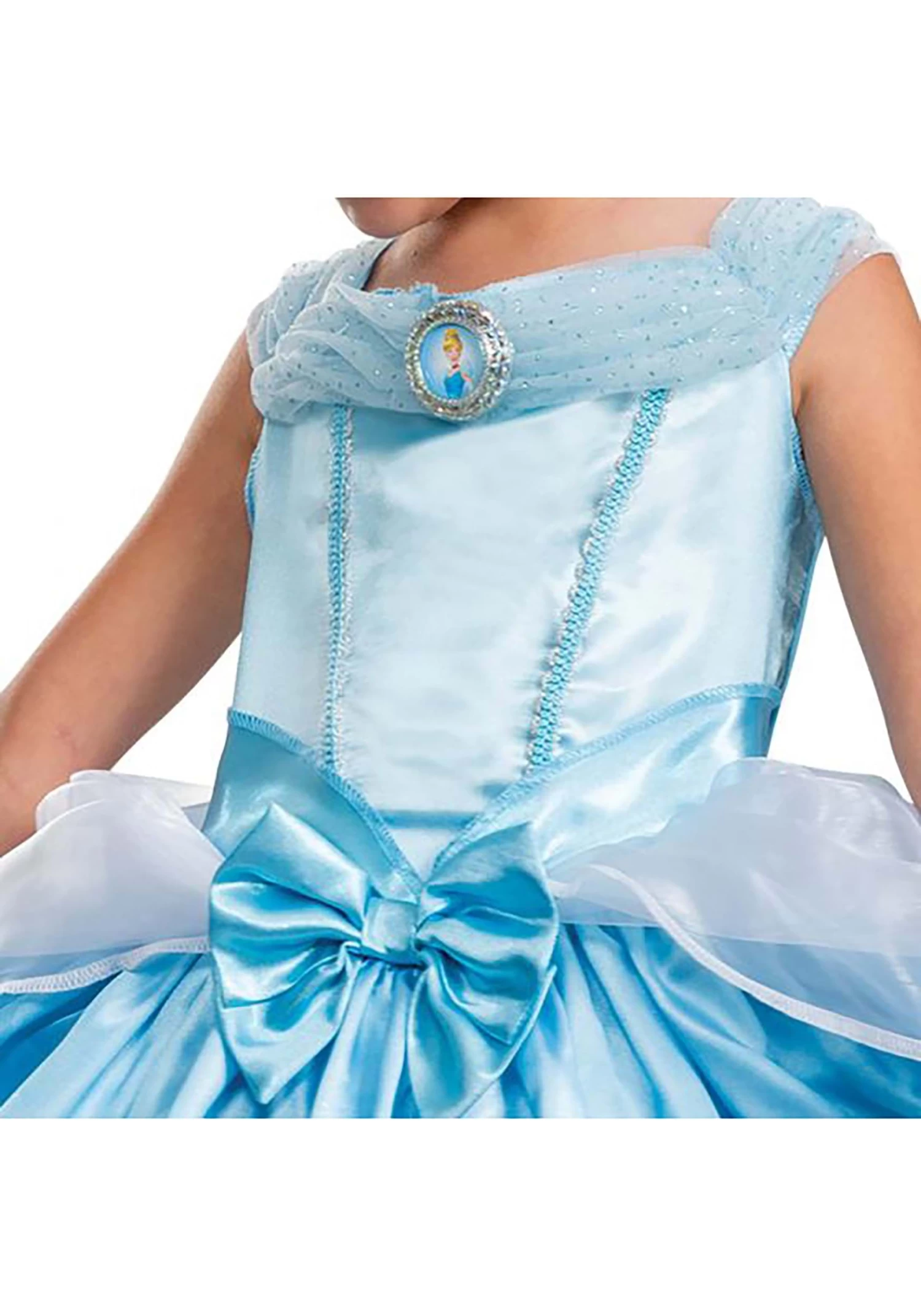 This officially licensed Disney Deluxe Girl’s Cinderella Toddler Costume is so magical that you’d think a fairy godmother’s wand created it! The sleeveless, knee-length dress has an ice-blue bodice with matching mesh trim around the neck and an attached cameo bearing a picture of Cinderella. The waist is decorated with an oversized blue satin bow and white mesh panniers. The knee-length skirt has a mesh petticoat and is printed with images of the Prince’s castle.