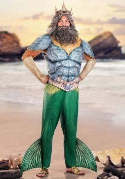 Look every inch the majestic underseas monarch in this officially licensed Little Mermaid Live Action Deluxe King Triton Costume for Adults! The short-sleeved jumpsuit fastens up the back and is designed to look like three separate pieces. The top is gently padded and sewn to give it a muscular appearance and is printed with silvery-blue armor details. A gold-tone belt is printed around the waist and embellished with a silver-tone seashell. The green pants have stiffened green fins sewn into lower side seams. Slip on the golden gauntlets and set the pointed golden crown on your head and you’re ready to rule the mysterious fathoms below!