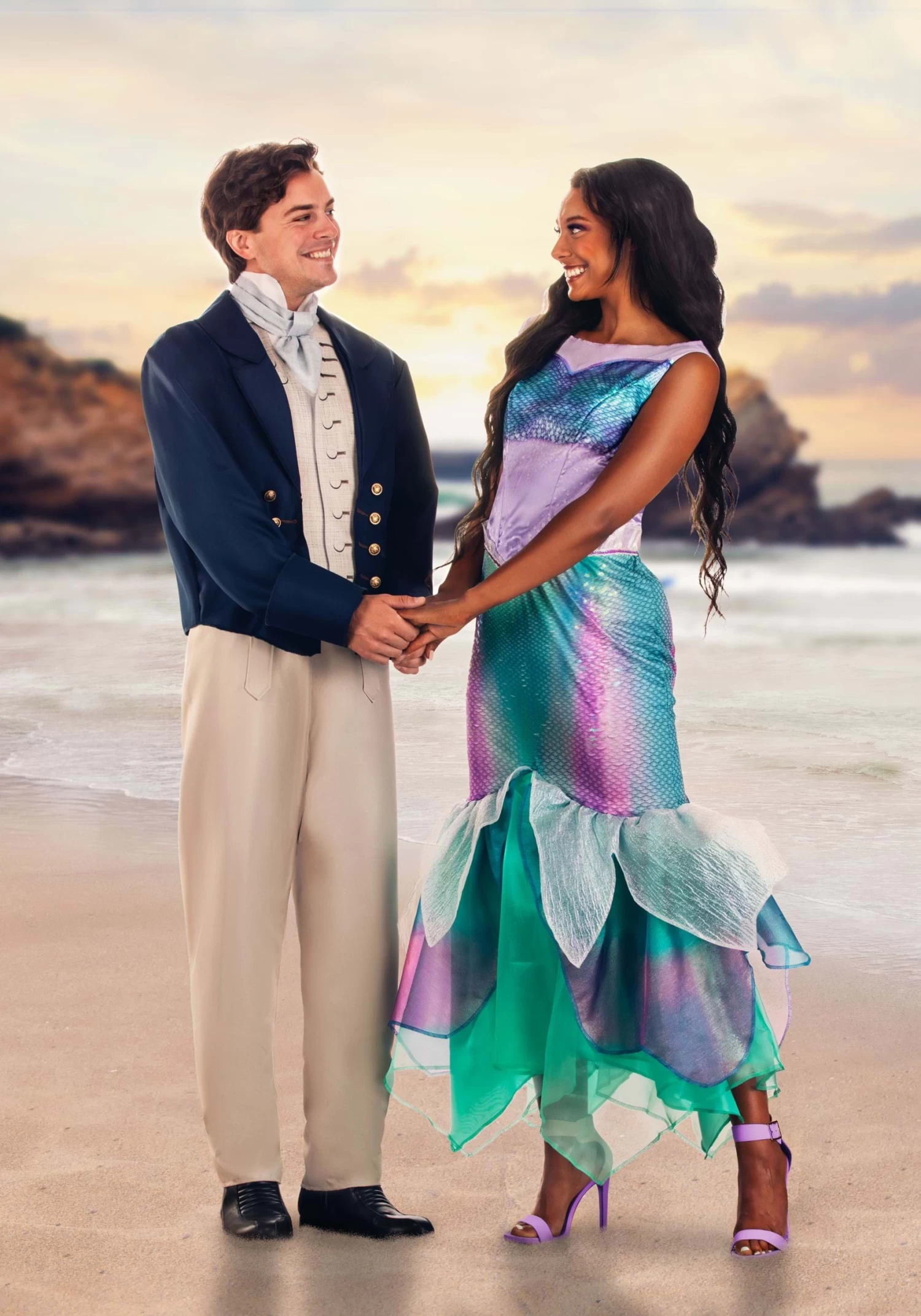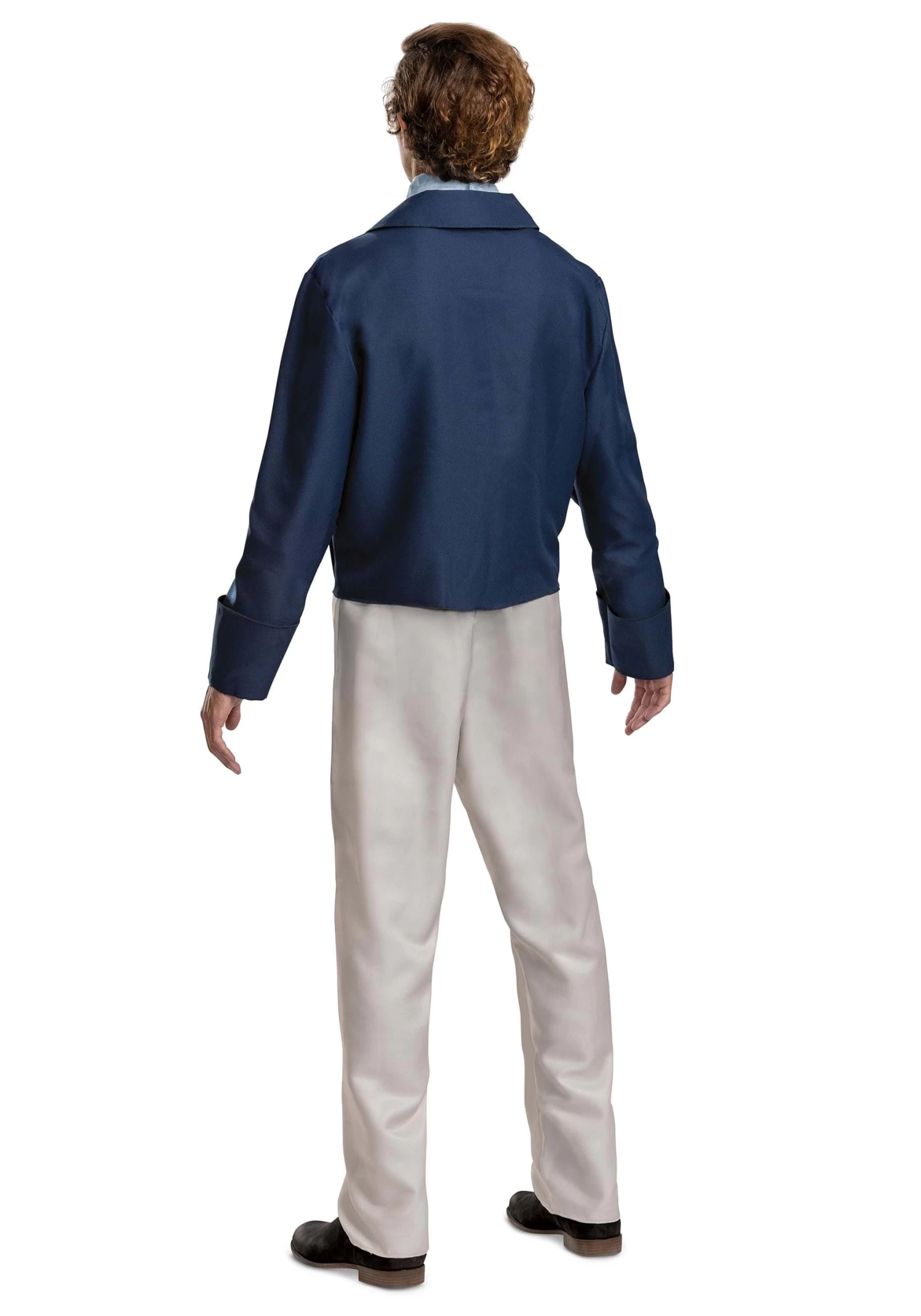 Look royally awesome in this officially licensed Little Mermaid Live Action Deluxe Prince Eric Costume for Adults! Royal yet nautical, the outfit includes a blue jacket top with gold-tone values and wide wrist cuffs. The attached grey vest panel has printed value details and looks great with the pre-tied light blue cravat. The light grey pants have a wide blue waistband.