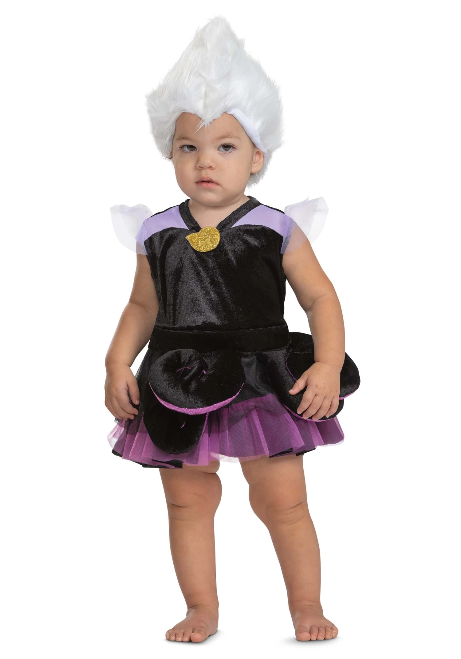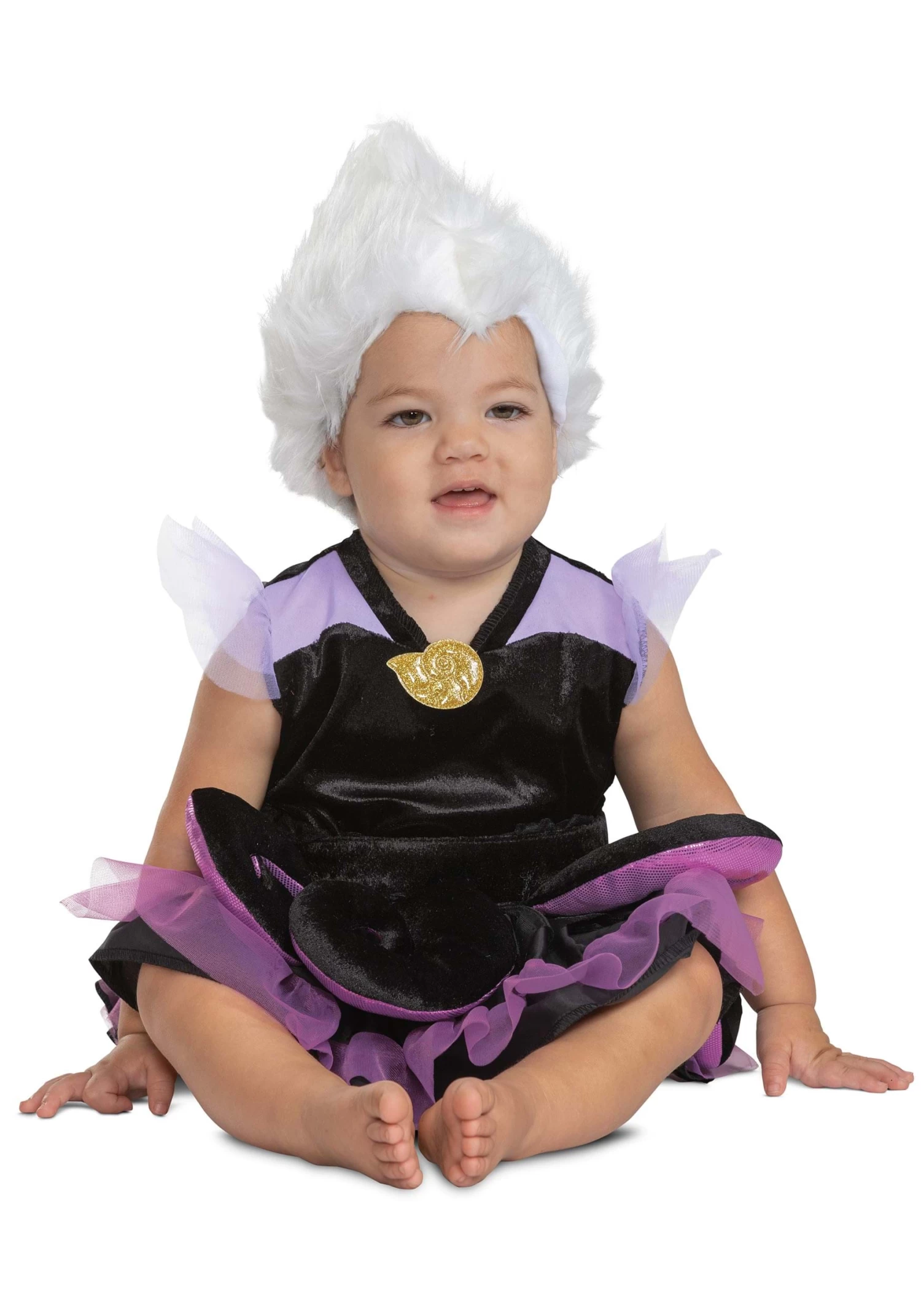 Your child will look darling and devious in this officially licensed The Little Mermaid Infant Ursula Costume! The dress fastens at the center back and is made of soft black velour with purple accents. The neckline is decorated with a shell made of golden fabric, and the shoulders are sewn with sheer tulle wings. The skirt is trimmed with a ruffle made of purple tulle. A black velour belt sewn with soft-sculpted squid tentacles made of black and purple fabric attaches behind the waist.