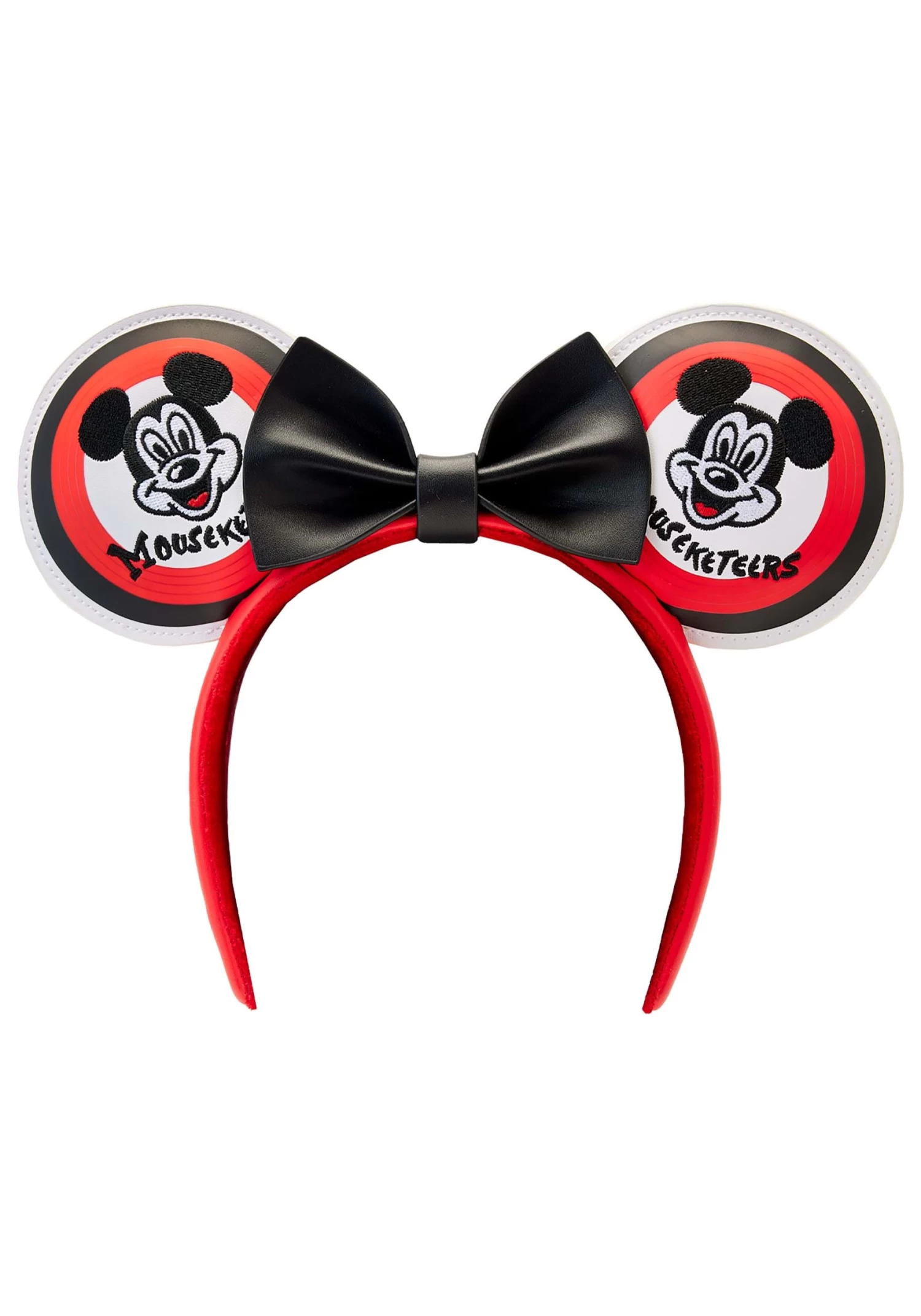 Show your love of your favorite club with this officially licensed Loungefly Disney 100th Anniversary Mouseketeers Ears Headband! The faux leather headband is decorated with two faux leather mouse ears, both of which are printed with images of Mickey and the word “Mouseketeers.” A black faux leather bow is attached between the ears.
