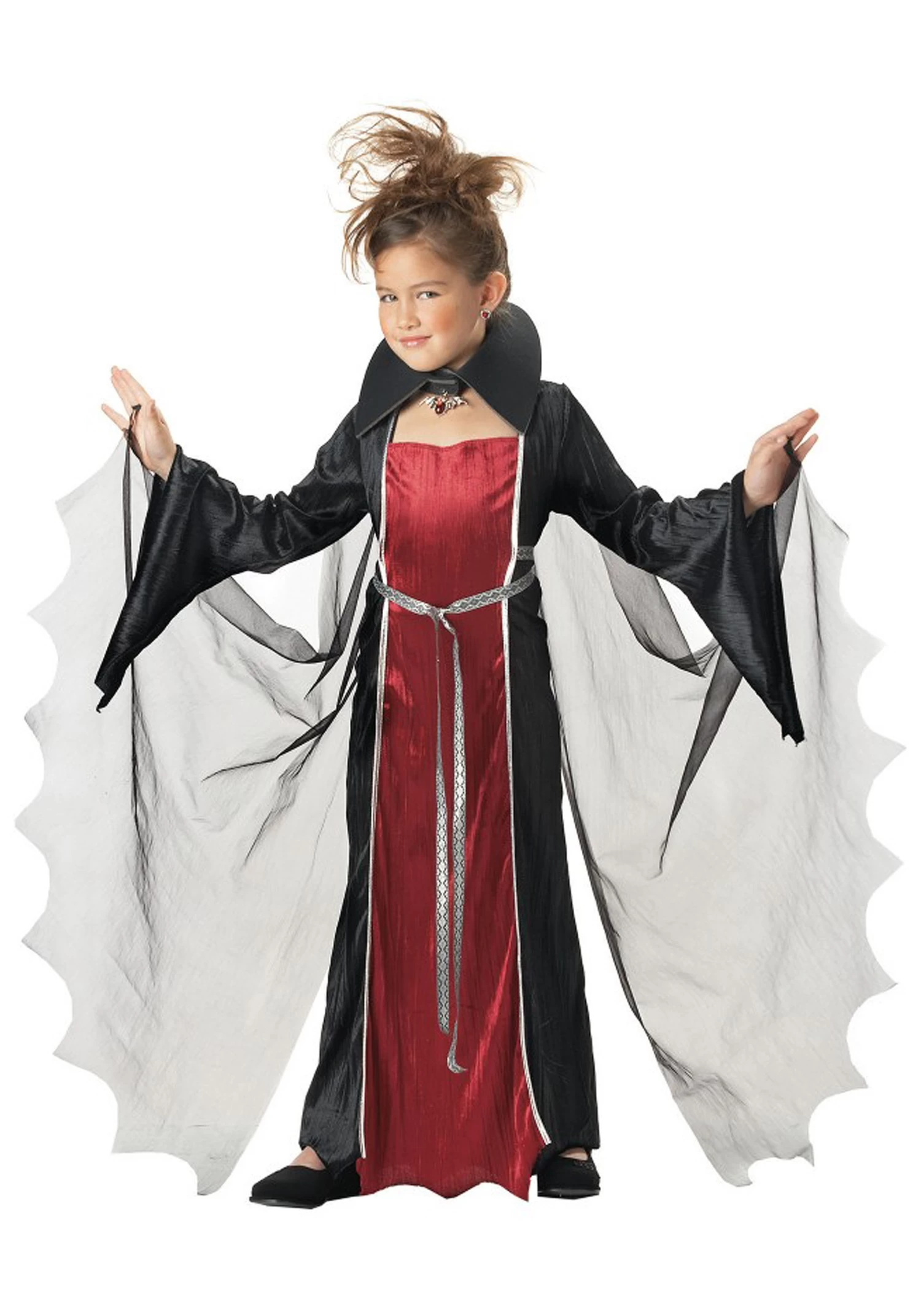 But that’s the real trick! The Vampire Lord isn’t the master of the undead at all. You know the truth, thanks to the charming eye of your tyke who has convinced you to find this elegant Vampire costume! The black and maroon fabric is regal, even more when your lordly kiddo waves their undead arms and fans out these knit mesh wings with finger loops! The silver-tone bat charm and its vivid red faux gem clearly possess some serious magical mojo, but nothing nearly as potent as the smile your Vampirelet is going to give once a few mortal victims gasp in surprise at the true ruler of the darkness!