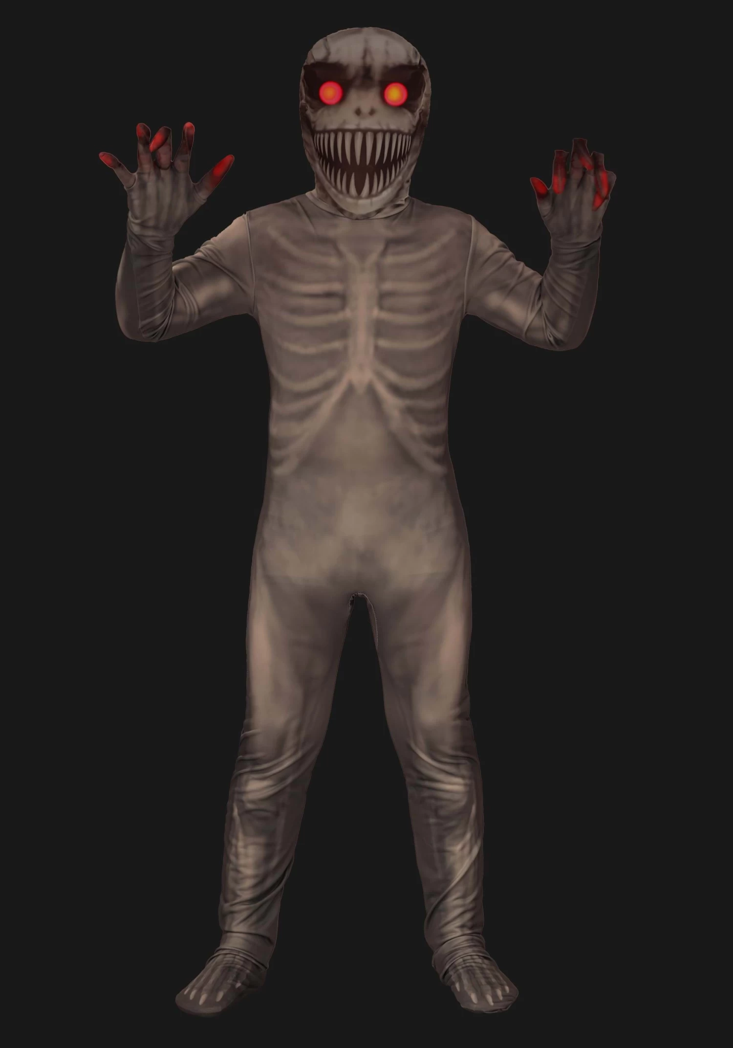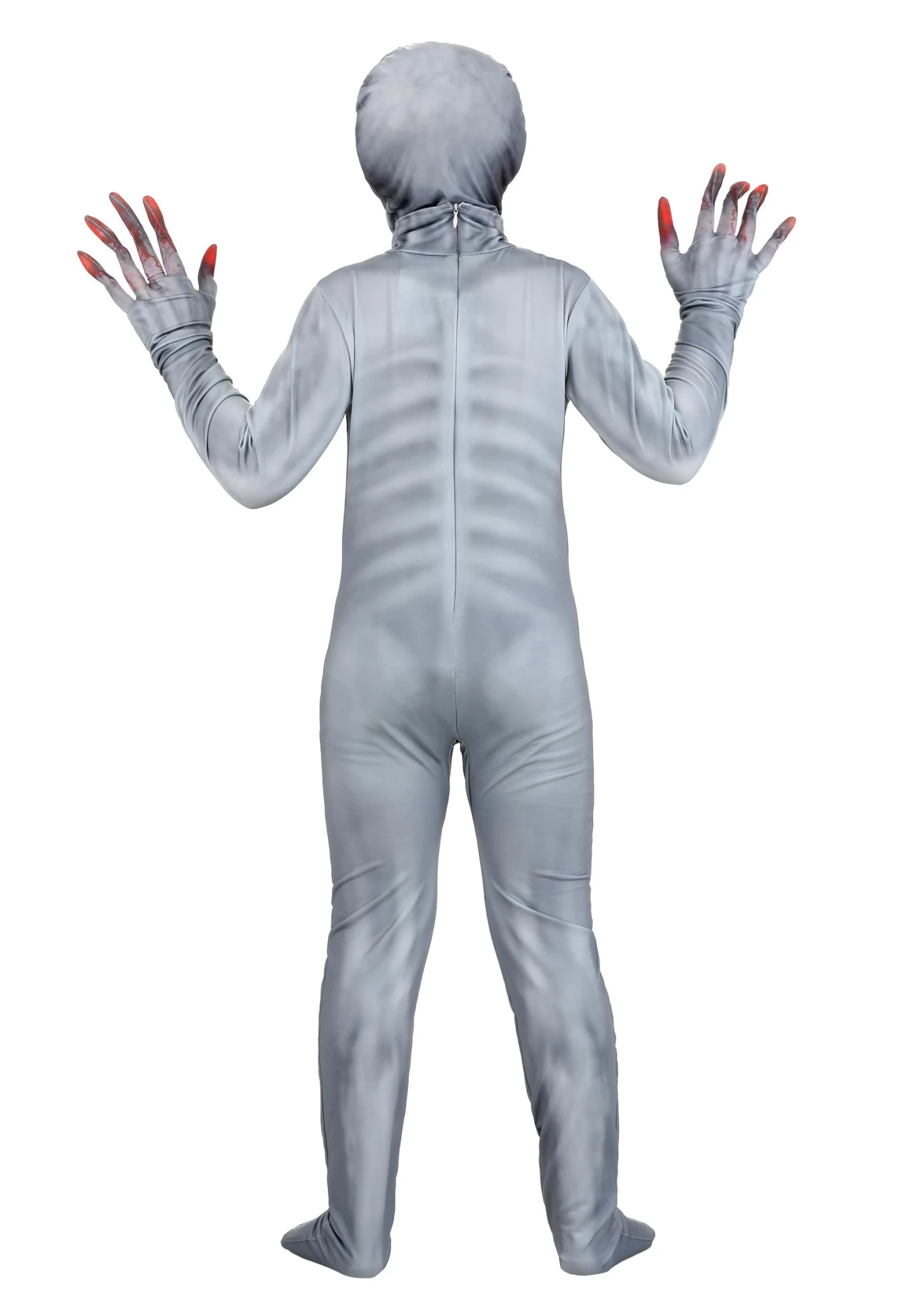 This child costume starts with a bodysuit that’s made out of a spandex blend material that stretches to fit. The exterior of the suit has printed details, which make your child look like some kind of evil creature from a nightmare! The sleeves end in attached gloves and the feet are also fully enclosed while wearing this costume! The costume also has a hood, which covers the entire face and head, and even has a printed skeleton face on the front.