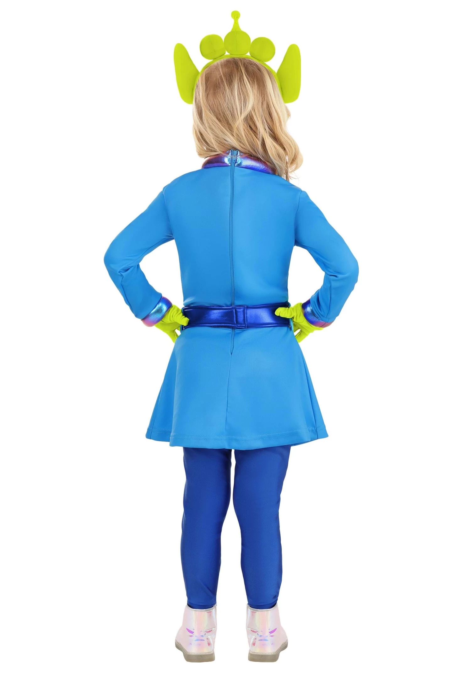 A metallic fabric belt, iridescent collar, and cuffs give the costume futuristic style. Meanwhile, a printed Pizza Planet logo, green gloves, and headband with soft-sculpted Alien facial features ensure that toddlers look and feel like their extraterrestrial toy pals!