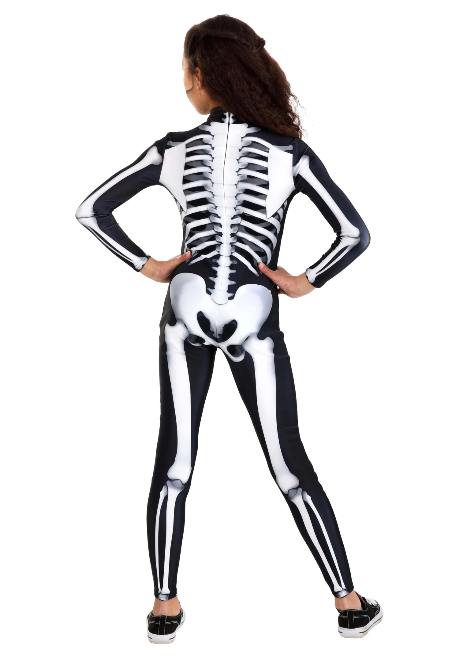 Look like a walking, talking X-ray when you wear this exclusive Girl’s Skeleton Jumpsuit Costume! The one-piece jumpusit fastens up the back and is made of comfortably stretchy black fabric. It’s printed all over with graphics of a realistic skeleton, including arm and leg bones as well as spine, ribcage, and pelvis. Fainter detail around the midsection makes everyone who sees you think that they can see right through to the back side of your ribs.