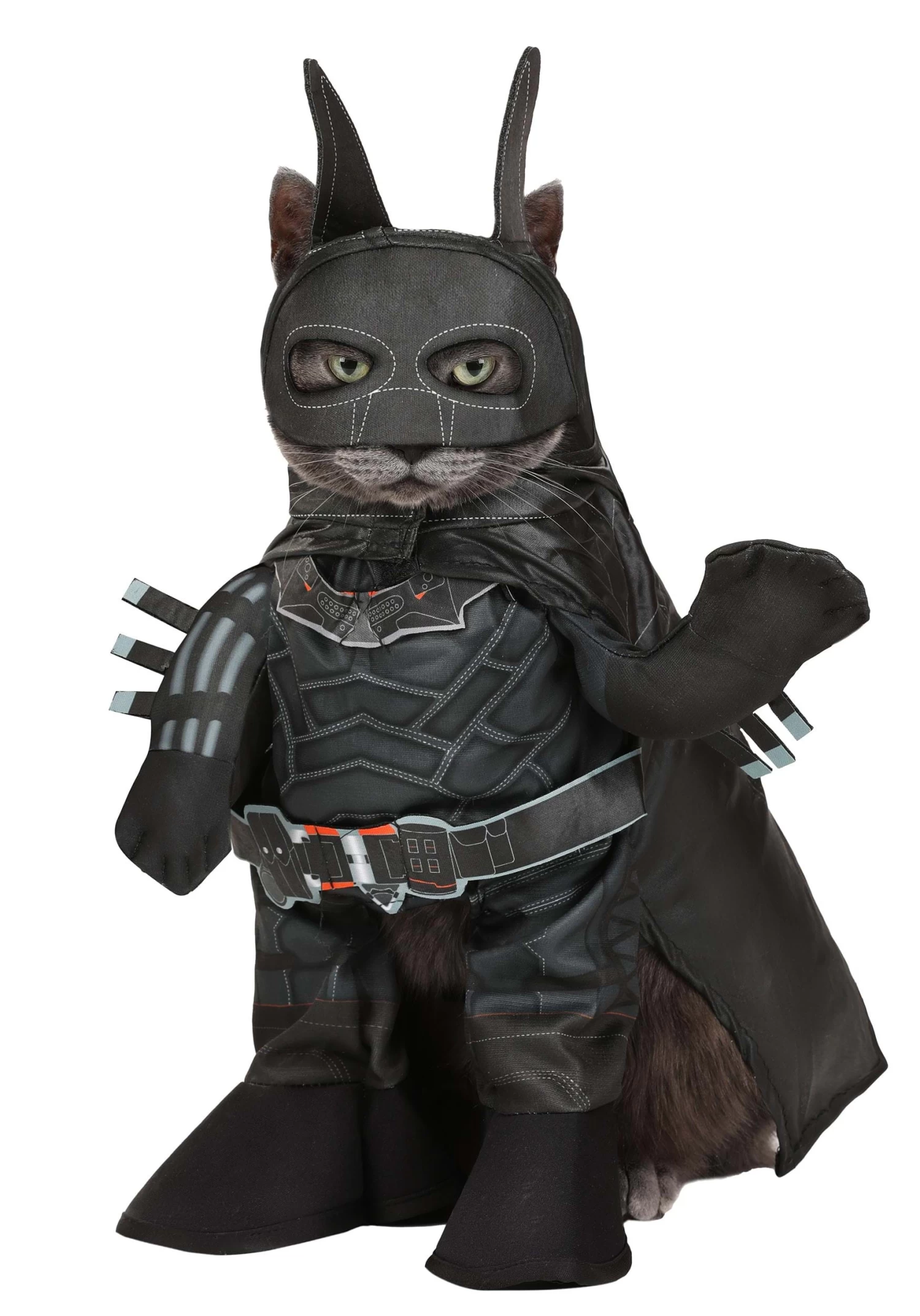 Your dog or cat will look ready to save the day when wearing this Gotham Batman Pet Costume! The soft suit slips on over your pet’s front legs. The chest area has printed armor details and has a shiny bat-shaped collar. Stuffed arms are sewn to the front, and a stiff “belt” accessory adds realism. The outfit fastens comfortably behind your pet’s neck. The costume also includes a black hooded cape that fastens under your pet’s chin and belly. The top is decorated with two tall black spikes.