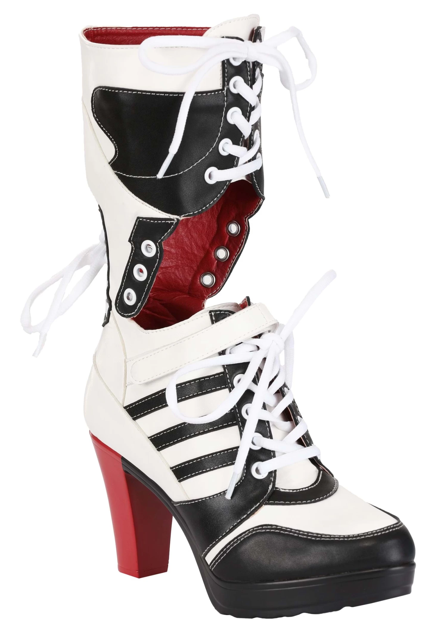 Thanks to these exclusive Harlequin High Heel Boots for Women, your outfit will be as legendary as your origin story! The high-heeled boots are made of red, black, and white faux leather. The high boot shafts have a cutout in the front and lace up over the arch, above the ankle, and around the calf.