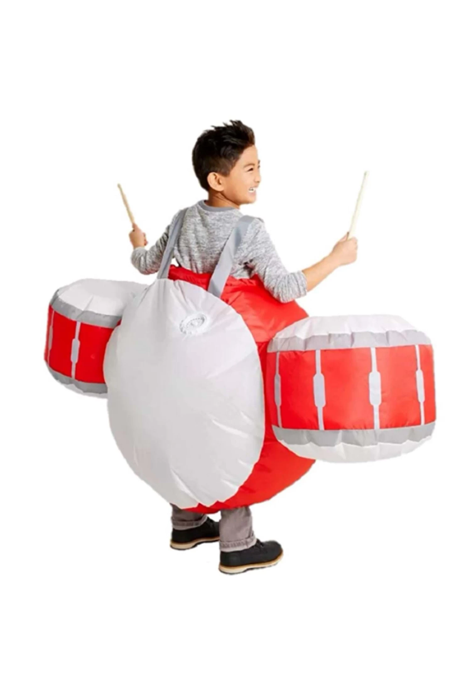 If you’re an aspiring rock god, you need this hilarious Inflatable Drum Set Costume for Kids! The blow-up costume features an attached fan that allows the whole outfit to keep its shape during the craziest performance. It features a life-sized center base drum with a white center and red rim. Attached to either side is a snare drum with a red rim and white strap graphics. Two woven gray shoulder harnesses keep the costume in place over your street clothes. Drumsticks included so that you can give the performance of a lifetime (Hint: the sound may be different from your typical drum kit).