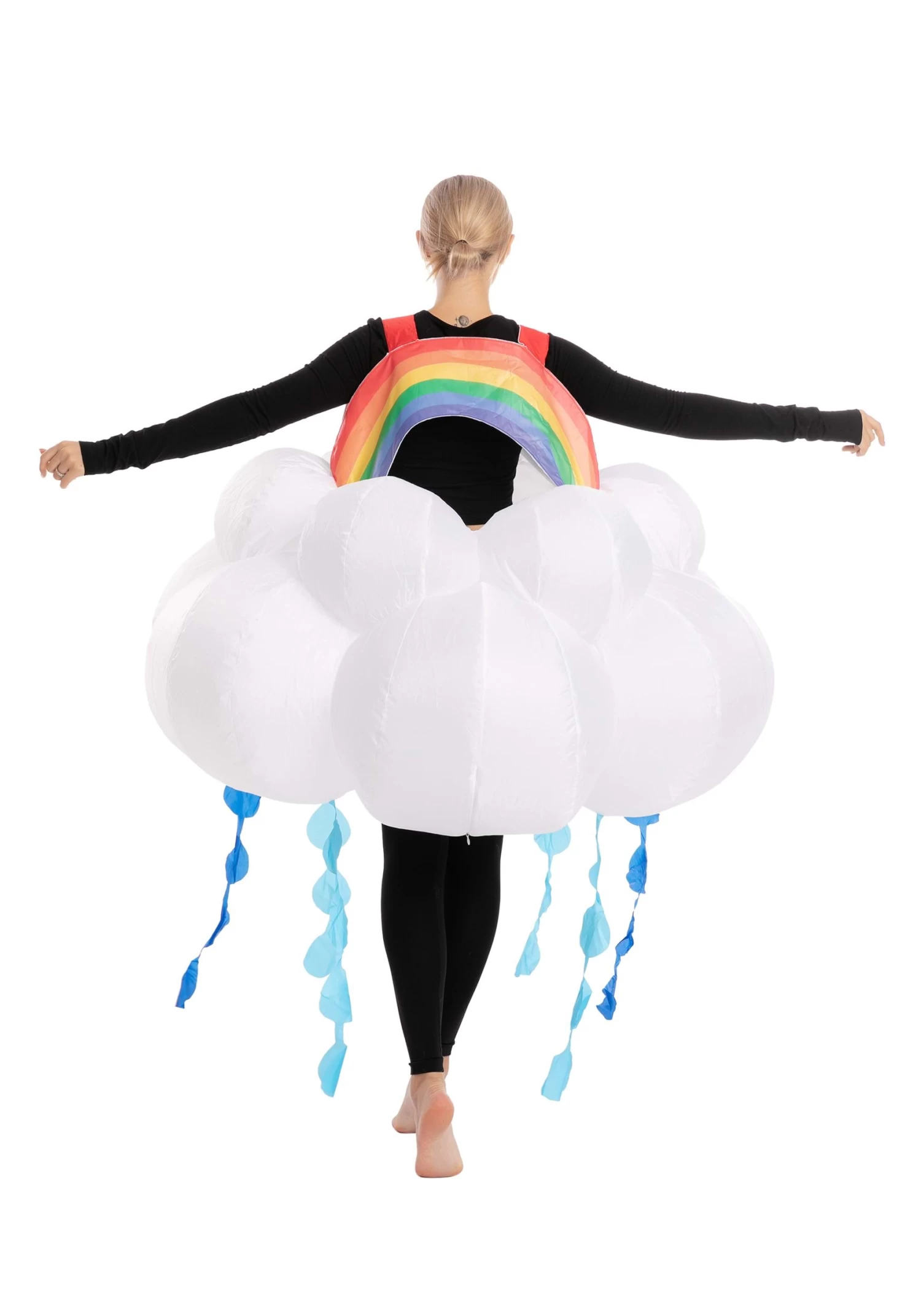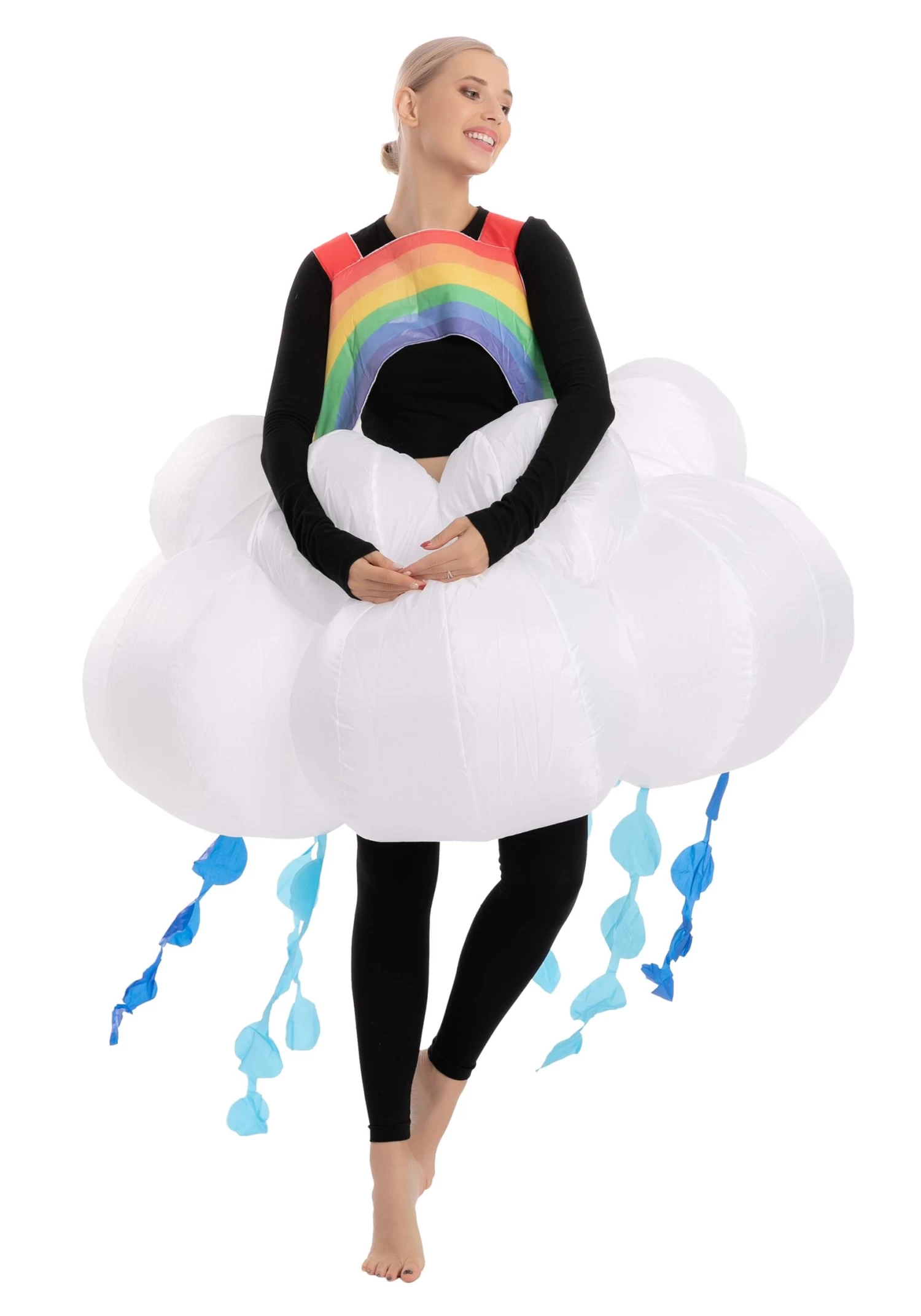 Have sunshine on a cloudy day when you wear this Inflatable Rainbow Raining Cloud Costume for Adults! The costume is shaped like a large skirt attached to a halter that’s shaped like an upside-down U and striped with rainbow colors. When fully inflated, the white bottom portion looks like a puffy cloud. Dark and light blue streamers shaped like raindrops are sewn to the bottom of the cloud. Wear it over lightweight street clothes for a costume that’s comfy and cheerful!