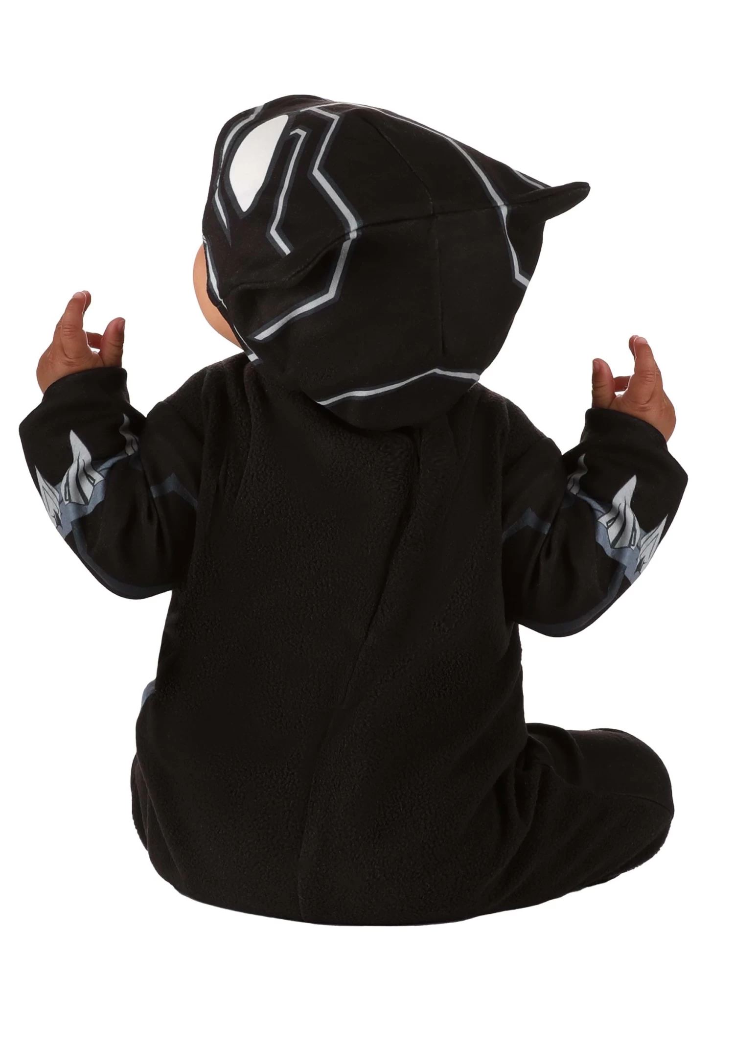 The soft black jumpsuit fastens at the back and is printed all over with graphics that resemble T’Challa’s armored suit, including the silver-tone claw “necklace” and matching silver-tone arm bands. The black booties’ soles feature printed graphics of the Black Panther’s symbol. The matching hat is sewn with ear-shaped points and printed with helmet graphics.