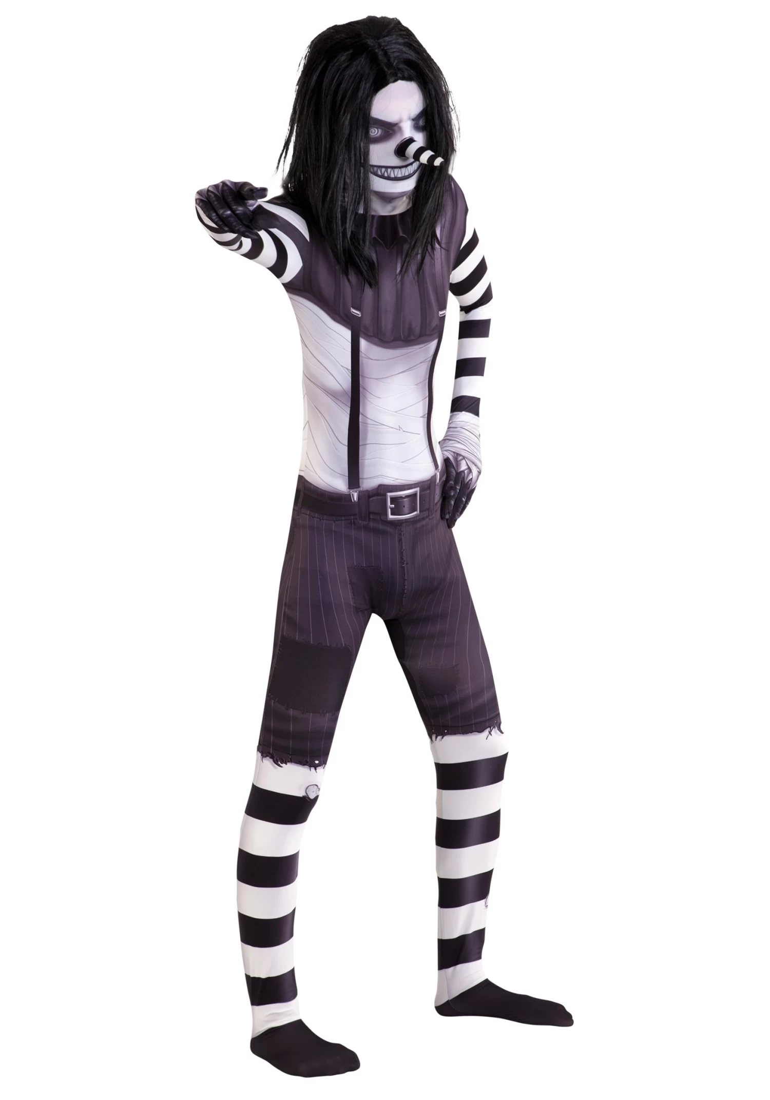 This black and white bodysuit encompasses the whole body, from the toes to the crown of the head. The long, striped 3D nose is a big feature on this suit! A long zipper at the back gives enough room for the child to step into the costume and pull their arms and head in afterwards. While there is some vision possible through the hood, take note that it is harder to see in this costume. Simply pull down the hood for a better view. Pop on the wig, and Laughing Jack is complete!