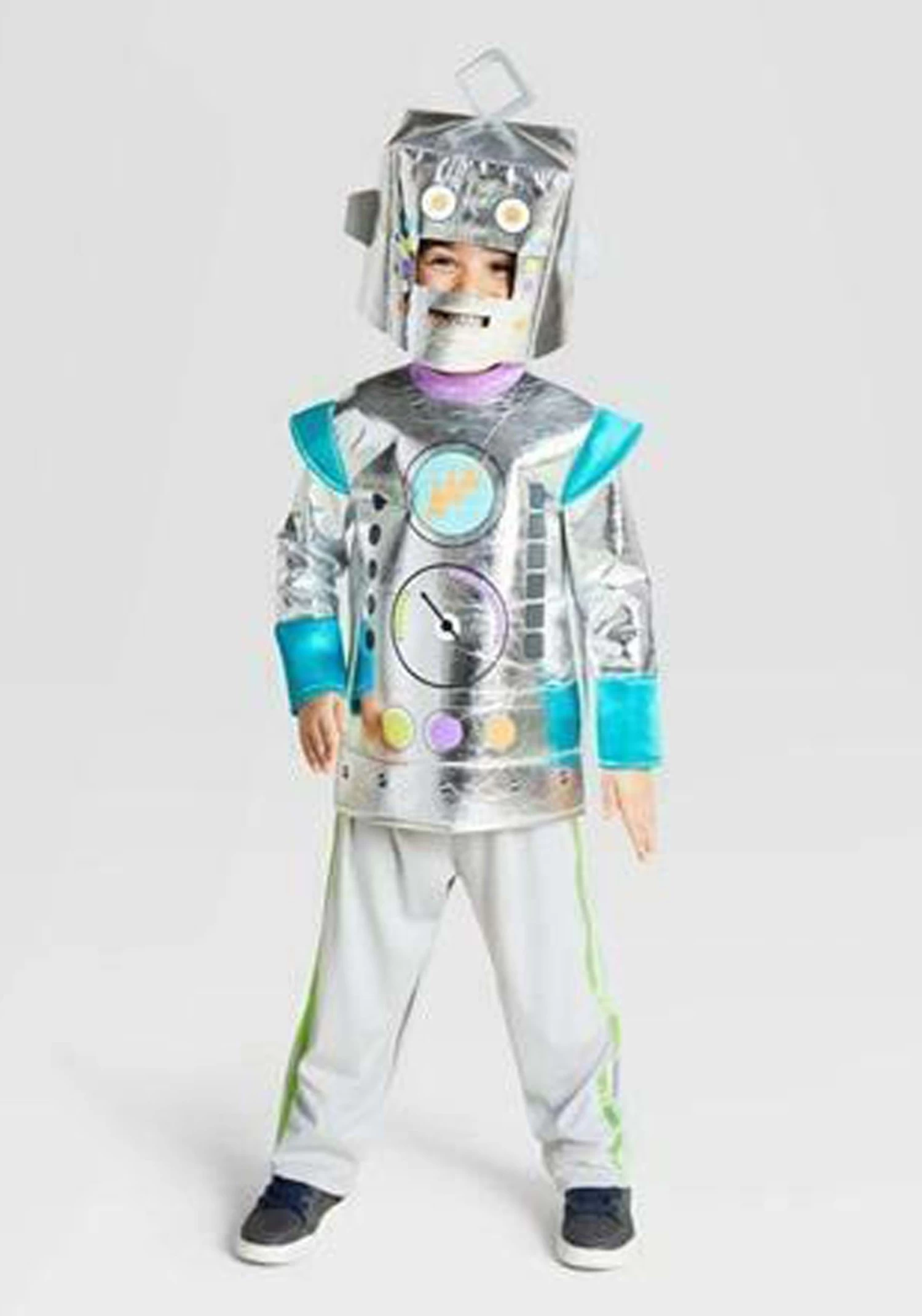 Complete a family costume theme or just let your kid celebrate his love of robotics with a Kids Robot Suit Costume! The shiny silver shirt is made of stiff yet moveable fabric to mimic a robot’s metal and has super-cool aqua details on the shoulders and wrists. A row of oversized value graphics border the bottom of the shirt and more details such as a large dial and an electricity symbol make the costume extra realistic. The headpiece has a large viewing port and the bottom has a slit for the mouth. Two felt “ears” stick out the sides so that the robot can hear directions (although it might not follow them). Two robot eyes and a diamond-shaped antenna finish the robot’s equipment.