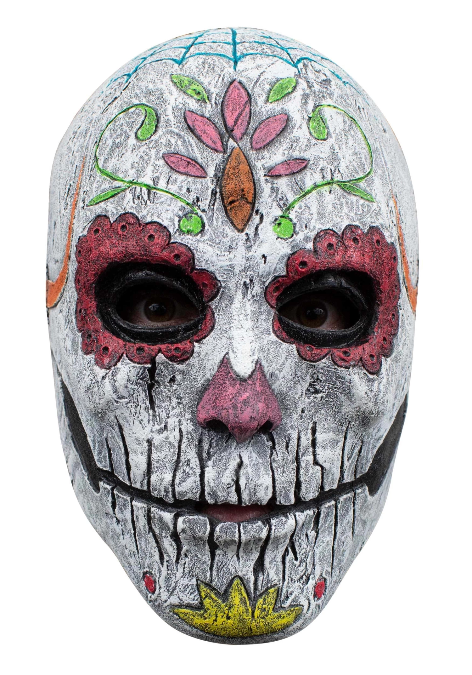 Save yourself some time and frustration with this La Catrina Full-Face Mask! This easy-to-wear accessory takes the makeup out of your hands and gives you the sugar skull artistry you’ve been craving. The white skull and colorful floral details have a distressed look provided by an all-over texture and grey shading. All you’ll need to add is some black face paint or eyeshadow to darken your lids. Paired with your LA Catrina costume, this mask will have you ready for Day of the Dead in no time at all!