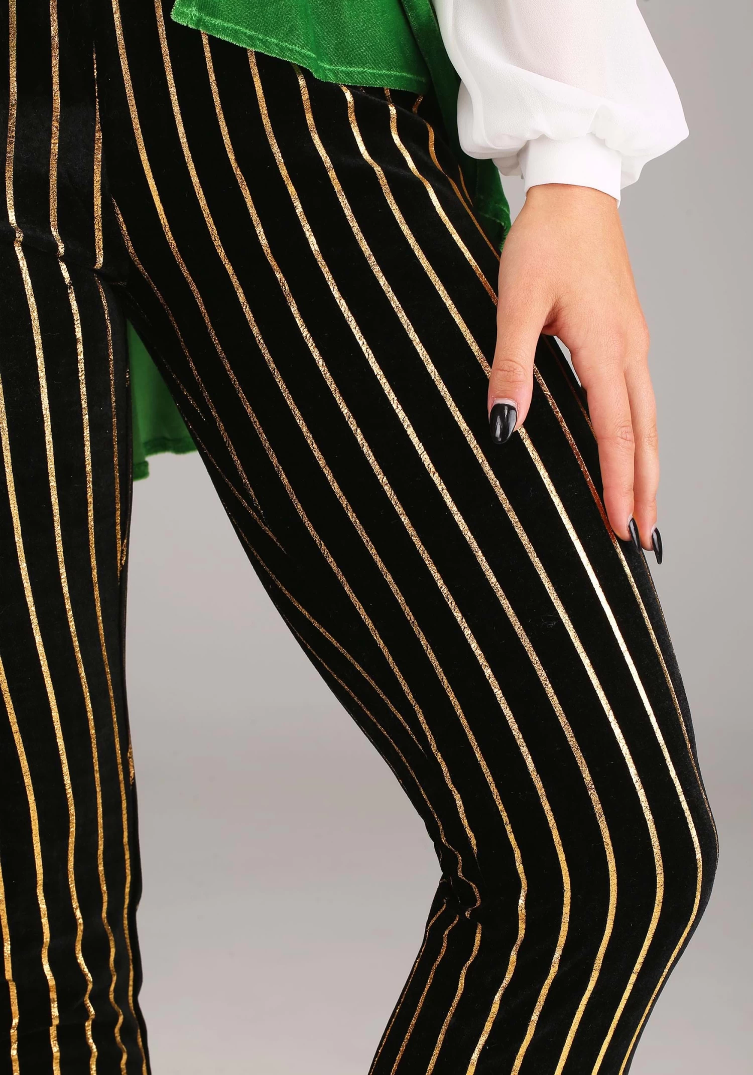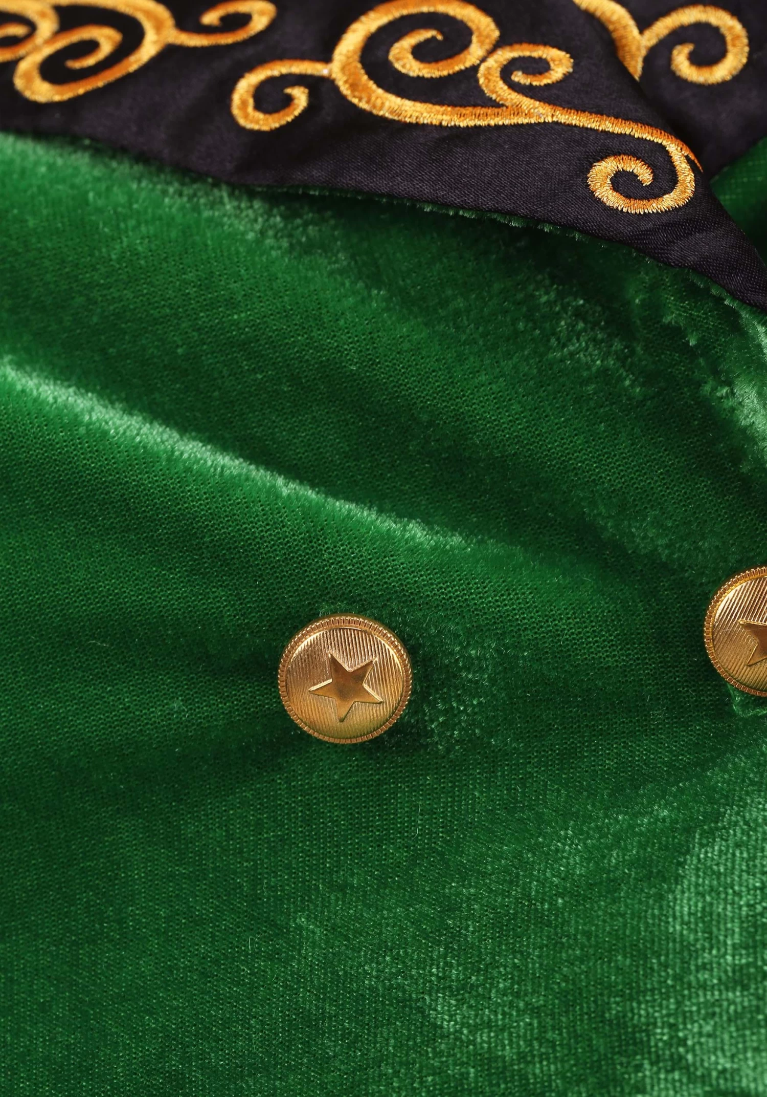 This exclusive Lavish Leprechaun Women’s Costume contains all the luck you’ll need to have an amazing St. Patrick’s Day! The sleeveless green velour top is designed to look like a vest, with gold-tone shamrocks and vines embroidered on the black lapels, a double row of golden values running down the front, and an asymmetric hemline that’s longer in back. It looks festive and fun when worn over your favorite value-up shirt. The black leggings have a comfortable elastic waistband and have narrow metallic gold stripes printed along their length. The headband with its attached mini top hat is the perfect addition to your hairdo!