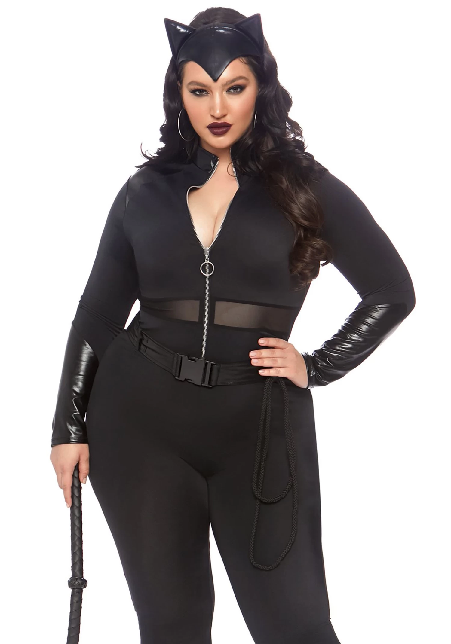 This gorgeous women’s jumpsuit is a real showstopper. The black suit zips up the front and has a strip of sheer fabric at the front for an extra serving of sultry. Faux leather accents the look on the shoulder and sleeves making up a faux gauntlet. The look is accented with a buckle utility belt with a rope and a cat ear headband.