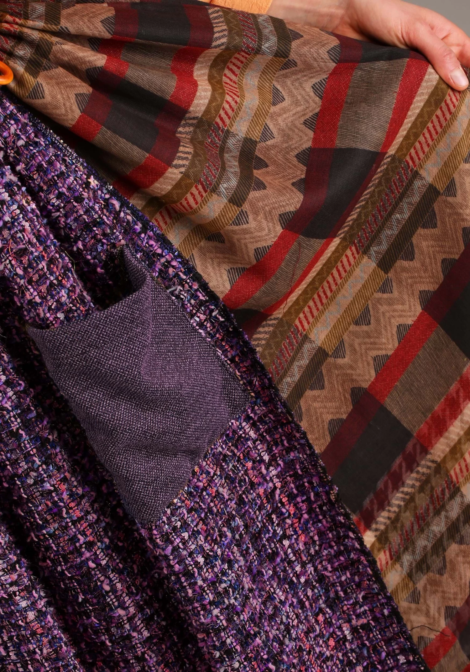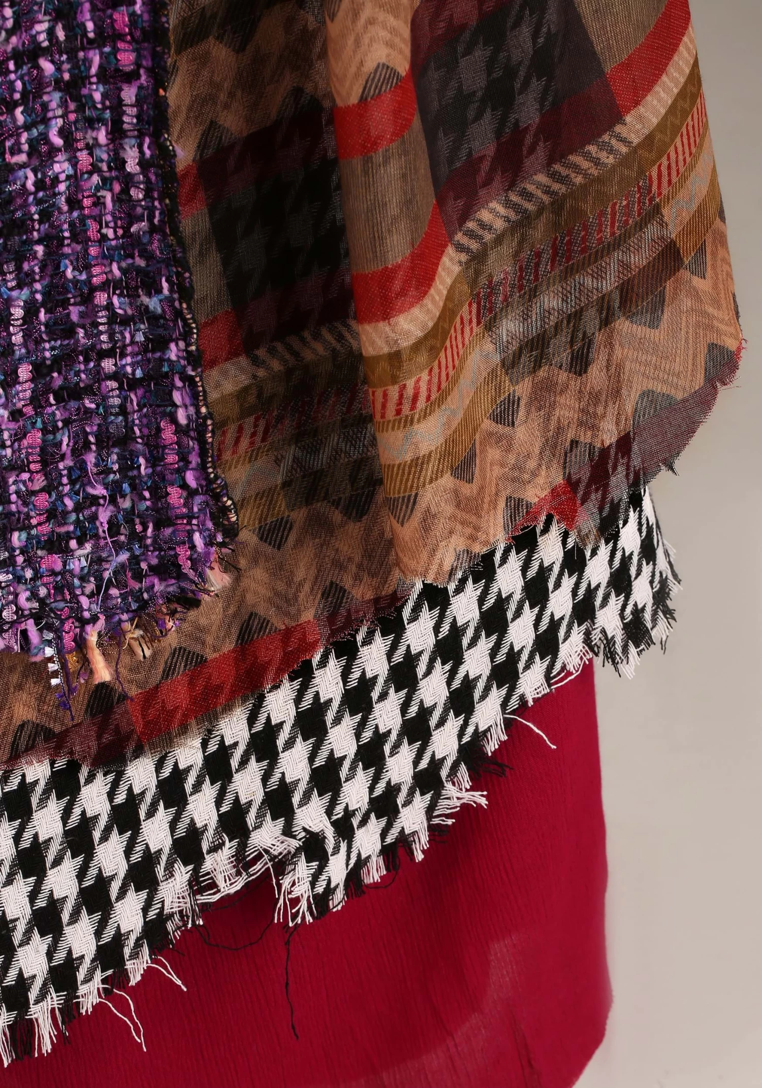 - Top layer is light weight patterned scarf fabric, middle layer is houndstooth acrylic, bottom layer is poly cotton gauze