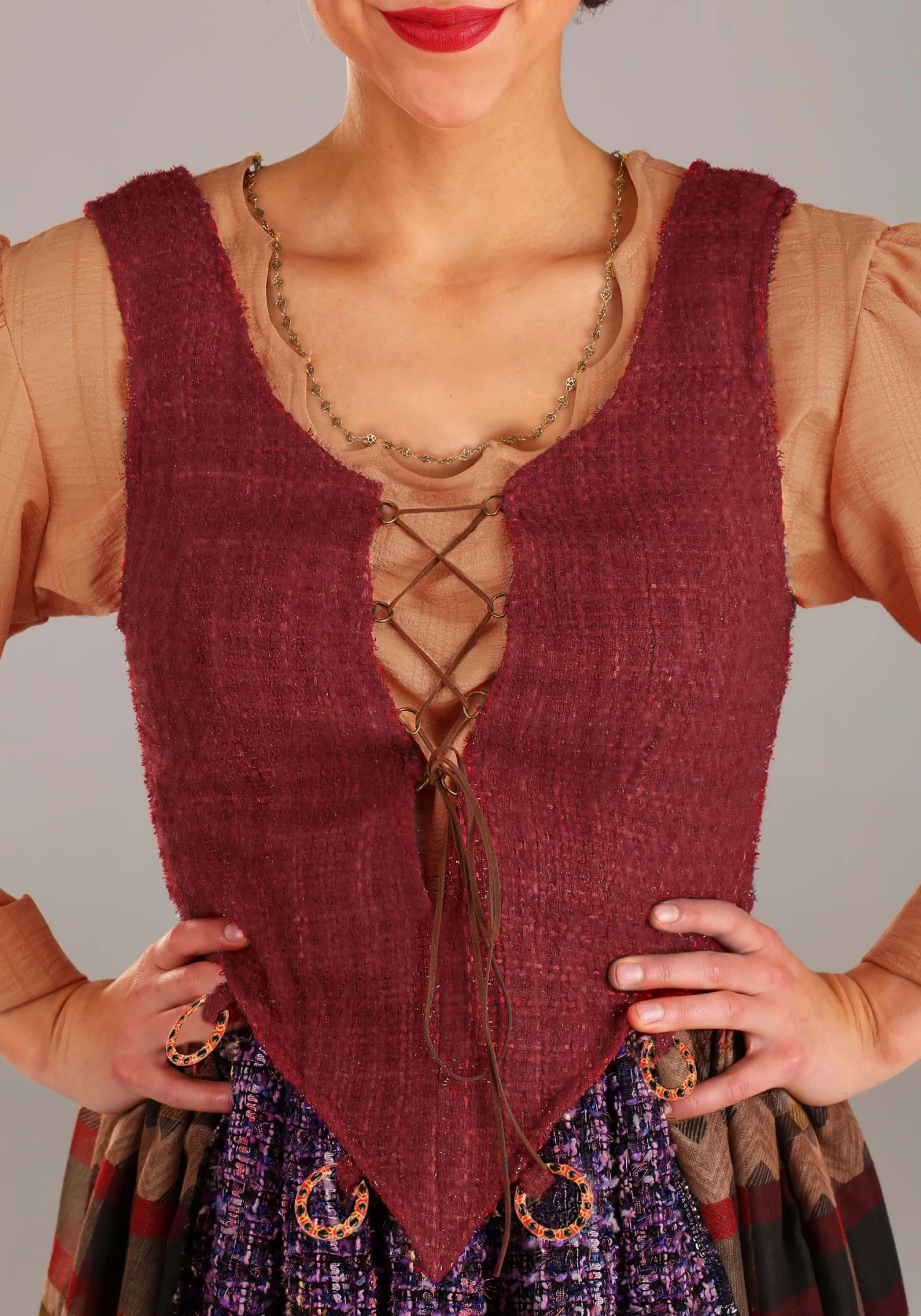 If you’re ready to be the sister who holds the whole group together, it’s time to whip up some magic in this officially licensed Mary Sanderson costume. Our own in-house design wizards studied Disney’s Hocus Pocus for a delightful number of hours to ensure we captured every eccentric inch of this iconic witch! The secret ingredient of this magical ensemble is layers. The skirt features maroon, houndstooth, and a lighter white layer and the apron shines thanks to its purple pockets! Brick red, bright orange, and antique brass-colored chains create the corset and the rest of Mary’s mystique. Last, but not least, who needs a witch’s hat when you have Mary’s twisted wig to top off the look! Gather up your Sanderson sisters for a Disney’s Hocus Pocus group costume that will make you infamous for Halloween seasons to come.