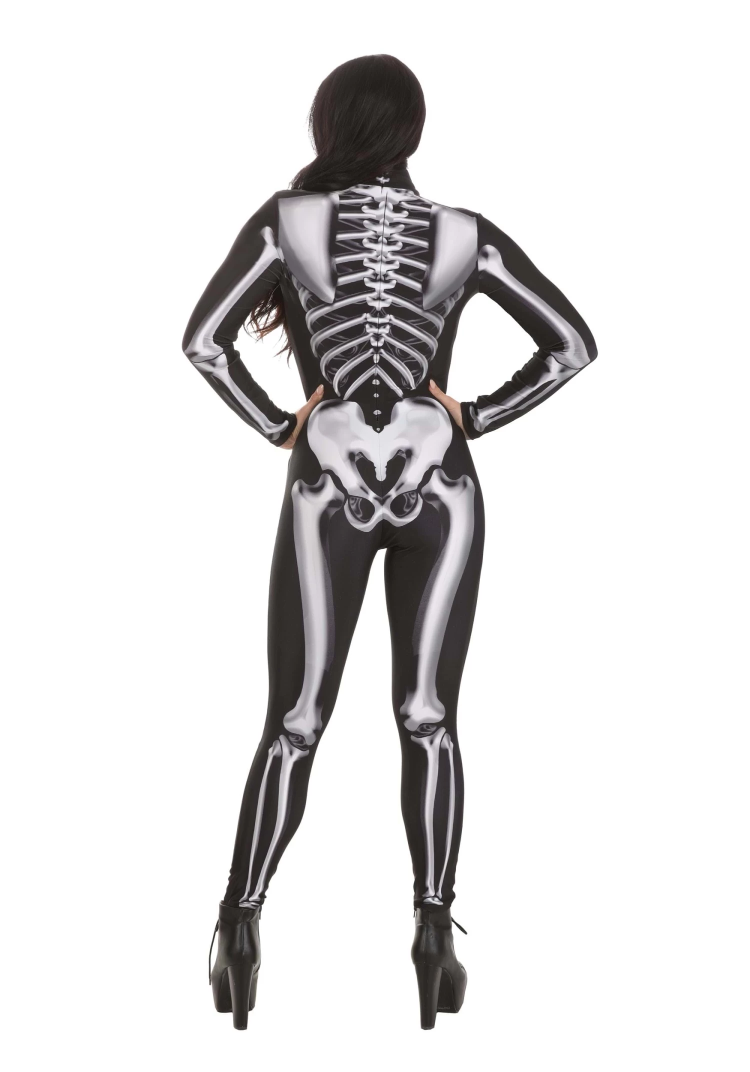 You’ll look positively scintillating in this exclusive Metallic Silver Skeleton Costume for Adults! A fun take on a traditional look, the unisex jumpsuit fastens up the back and is made of comfortably stretchy black fabric. From the high collar to the fitted ankles, both the front and the back of the suit have realistic-looking printed silvery bones, including ribcage, spine, pelvic bones, arm and leg bones, kneecaps, and more. Wear it on its own or with a mask of your choice!