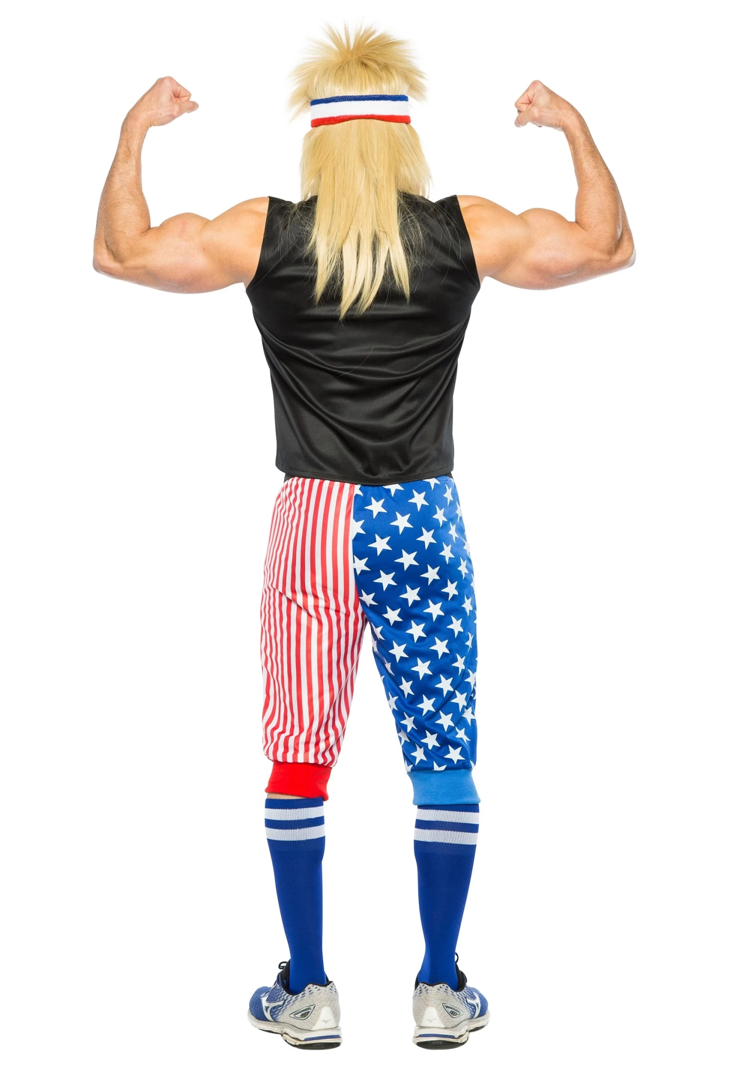Pledge allegiance to this awesome Men’s Murica costume! The black muscle shirt with “MURICA” printed in caps on the front proclaims your devotion to your native land. The cropped pants have the Stars on one leg and the Stripes on the other – just what Betsy Ross really envisioned when she first dreamed up the flag. An elastic waistband and blue and red rib-knit cuffs hold the pants in place while you tell your friends “Hold my beer and watch this!” The blue athletic socks are 18 inches long, ending just under the pants’ cuffs. Hold your important stuff in the 100 percent polyurethane foam fanny pack with a star and “USA” printed in white on the front. The elastic waistband has a hook and loop fastener. Add the red, white, and blue headband and you’re ready to celebrate!