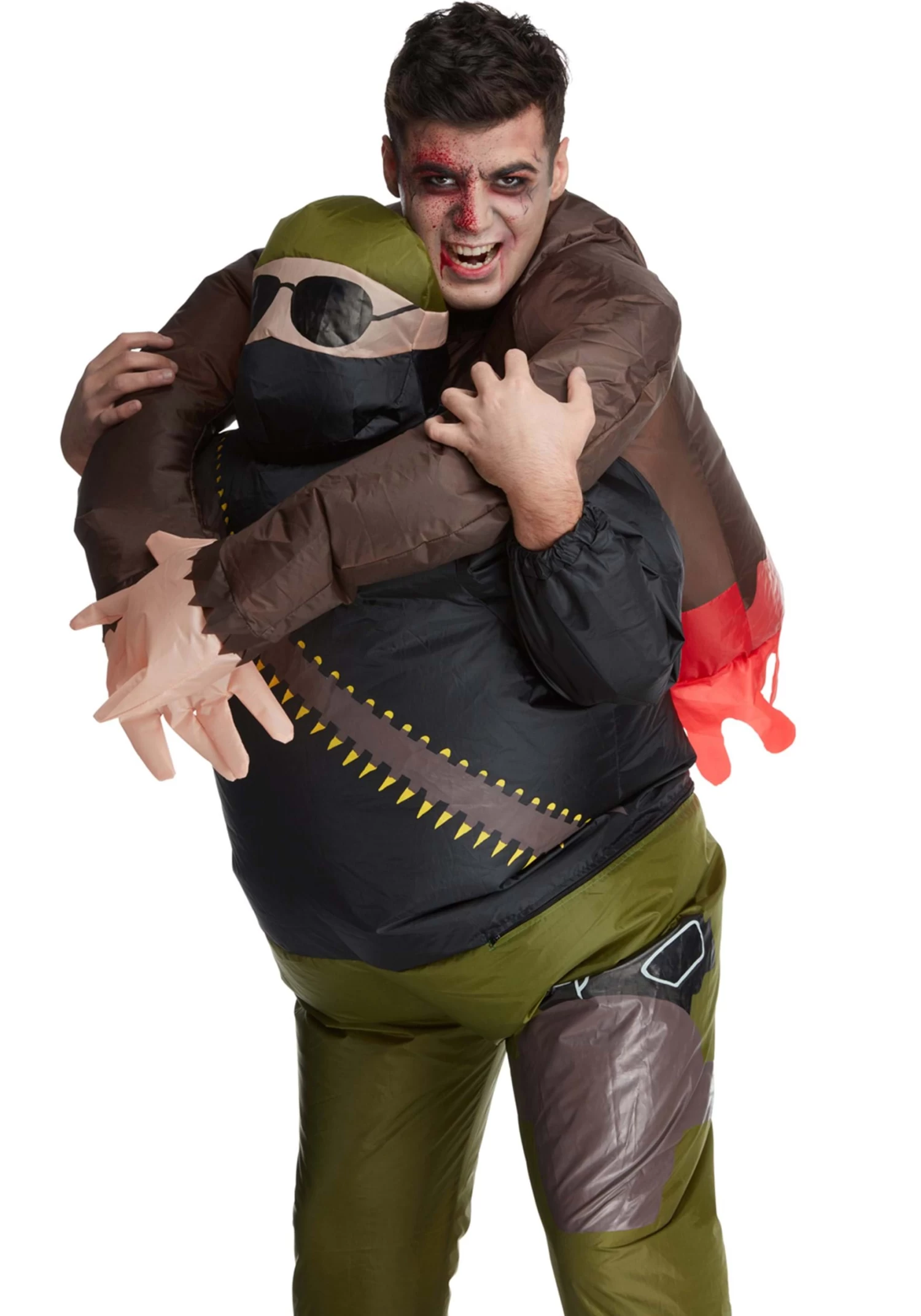 Actually, it turns out that you can pull a pretty convincing trick to dodge all the danger! Just climb into this Pick Me Up Zombie Hunter Inflatable costume! When you slip yourself into this inflatable jumpsuit and turn on the interior fan, in no time, you’ll be transformed into a wandering hunter and your own head will serve as the vicious zombie! Dress yourself up in the right kind of makeup and frizzled hair and every wandering zombie on the street will see that this Human is already being snacked upon and go off to find their own dinner. Not only are you secure from the undead but you’ve got one heck of a costume while you’re at it! Winner, winner, brainy dinner! (Wait—are you hunting brains now!?)