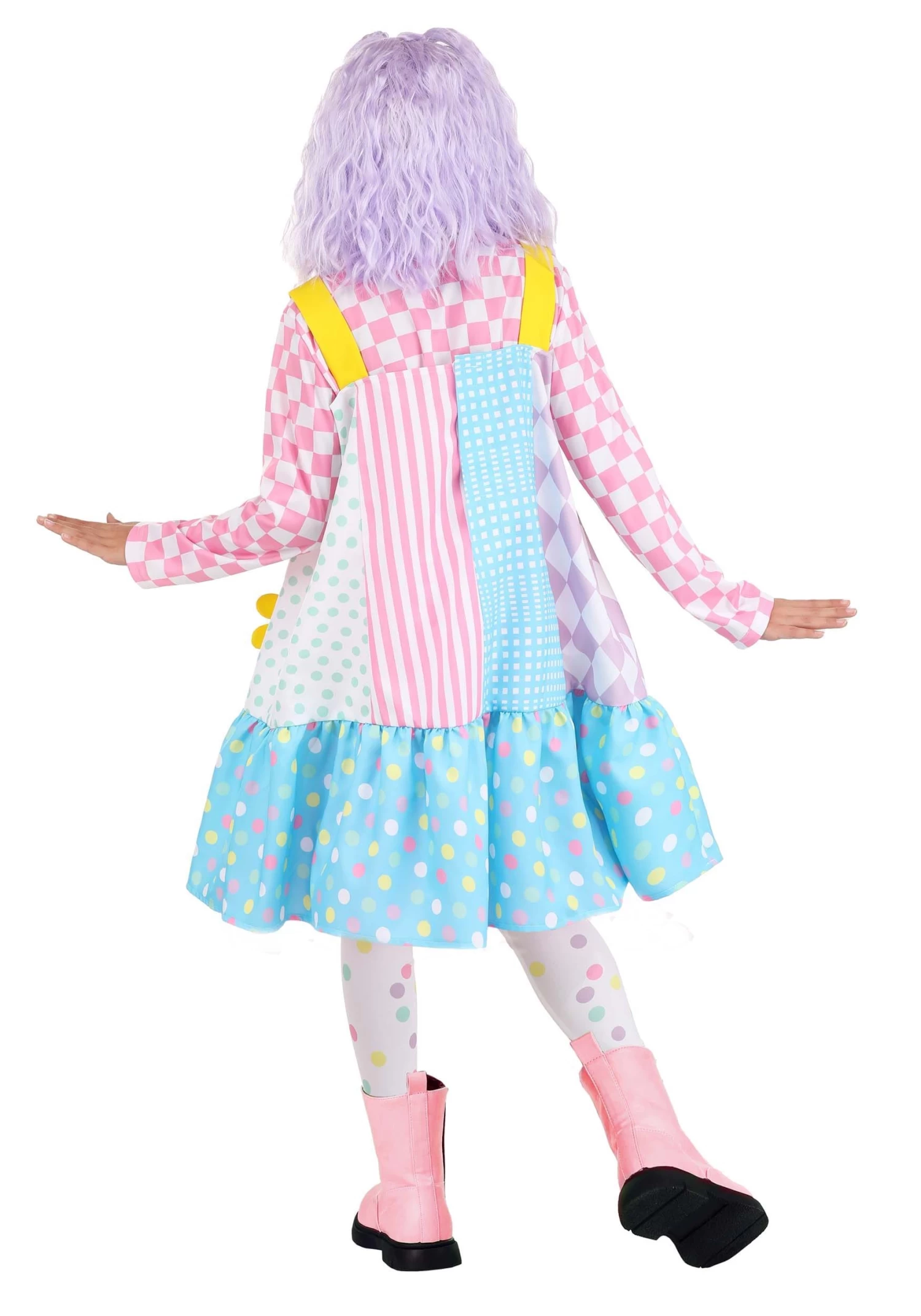 Give clowns a better name when you offer up this exclusive Pinafore Clown Costume to a kiddo! This is a Made By Us design that starts with a pink and white checkered shirt and a pair of pastel polka dot tights. Worn over top is a pinafore dress. The uncinched style, faux flowers, combination of multiple patterned panels, and the large values on the shoulder straps create a whimsical look that anyone is sure to love. Add a bright clown wig or pastel face paint to this outfit to complete a truly joyful time while your kid clowns around!