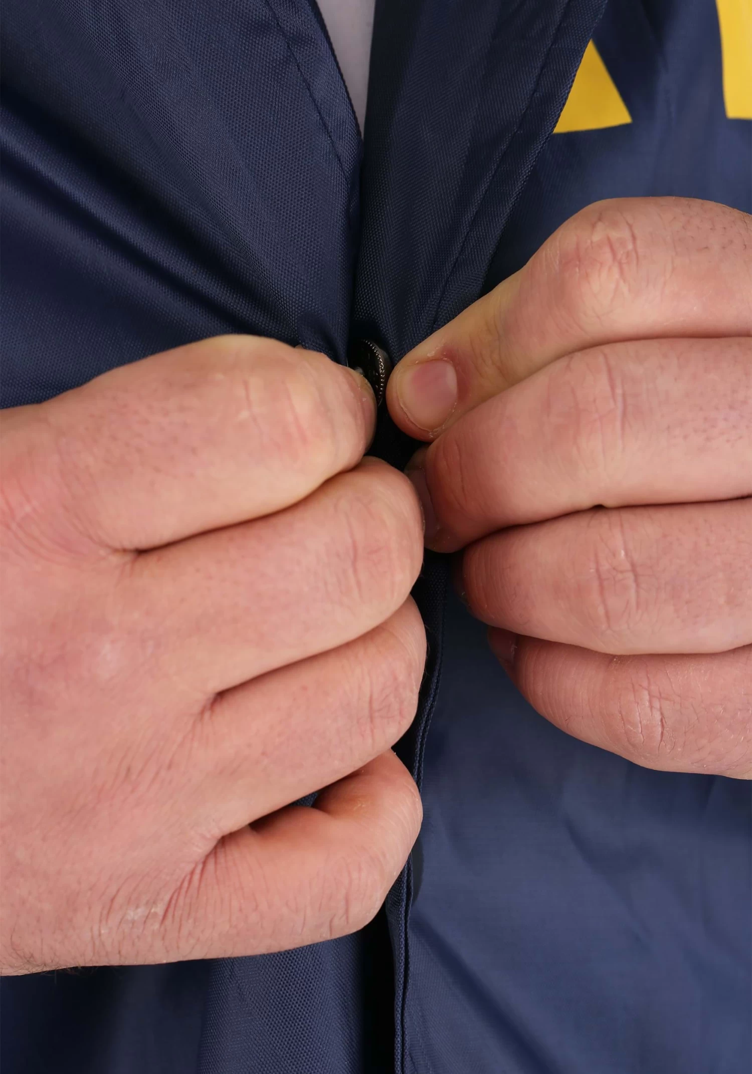 - Jacket has hook and loop fastener at center front behind decorative snaps