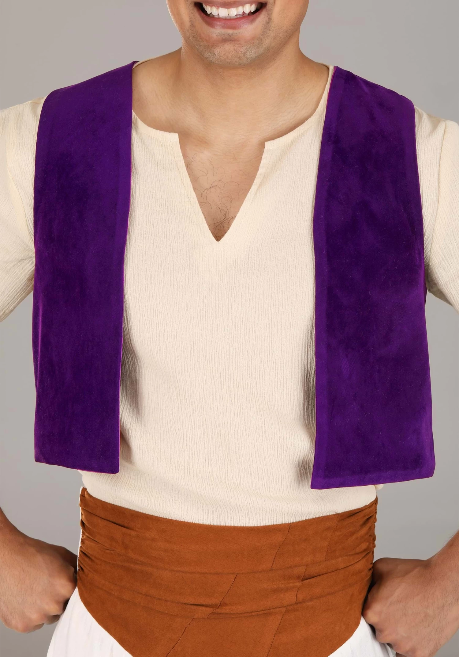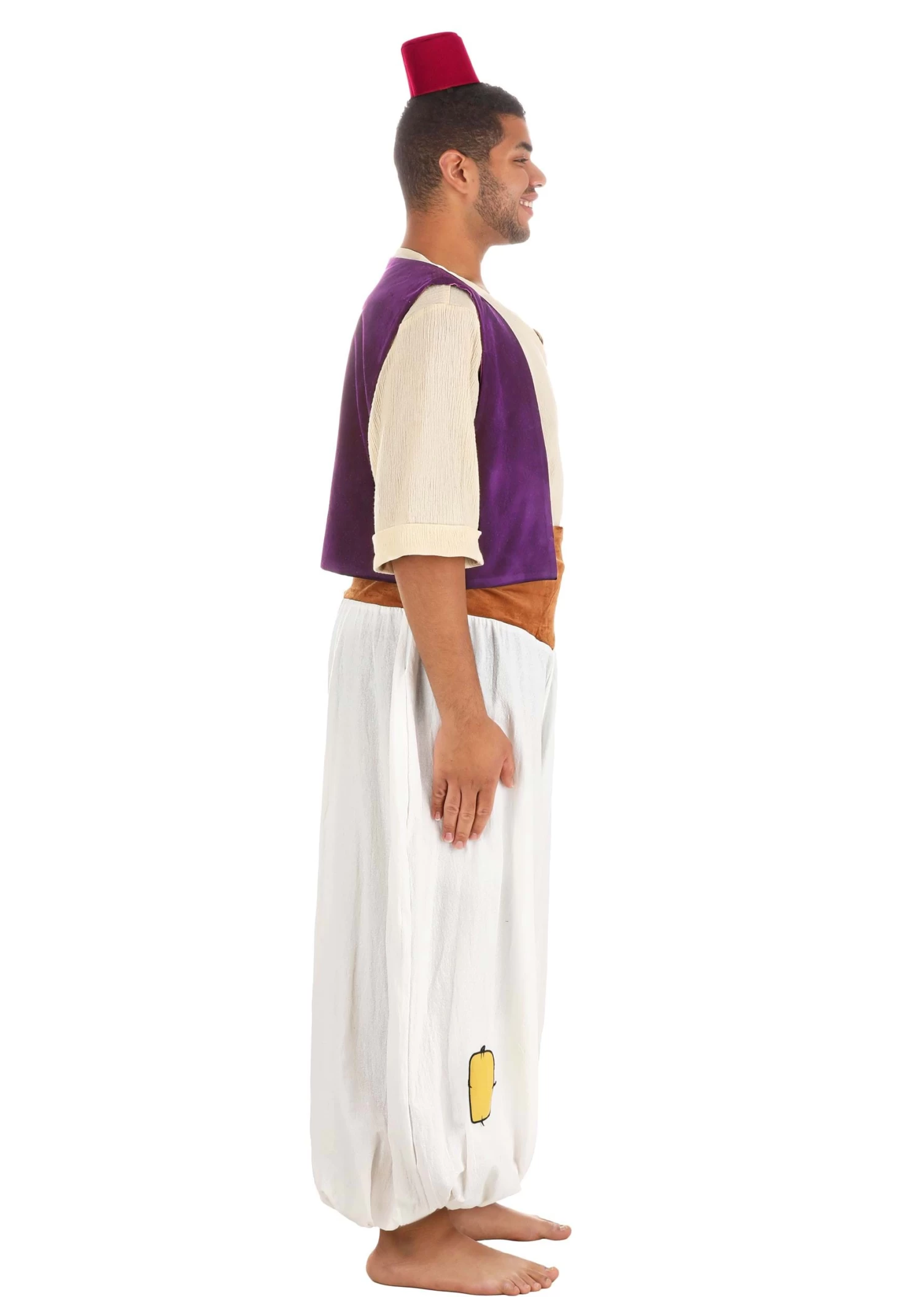 This officially licensed design was inspired by the diamond in the rough from Disney’s Aladdin. The costume starts out with a pair of billowy pants that feature a patch detail, and have elastic at the ankles. The purple vest is faux suede with a smooth satin lining, and it fits neatly over the light woven shirt. To top things off, we included Aladdin’s small red fez!