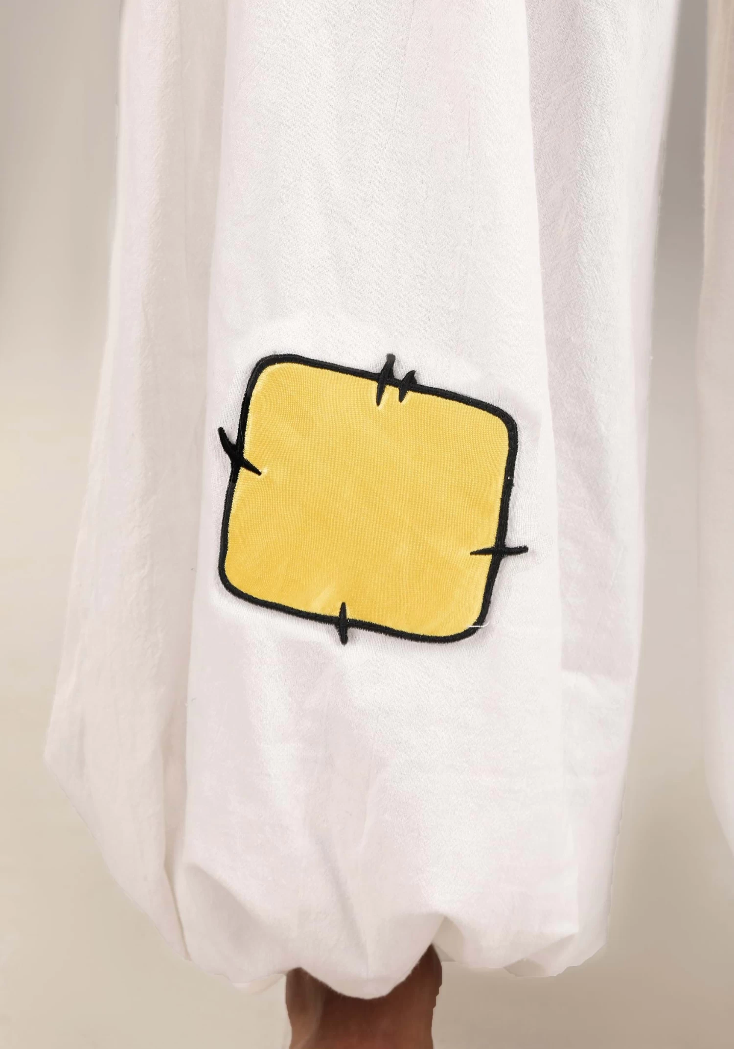 - Elastic in pants cuffs, patch sewn to lower right pants leg