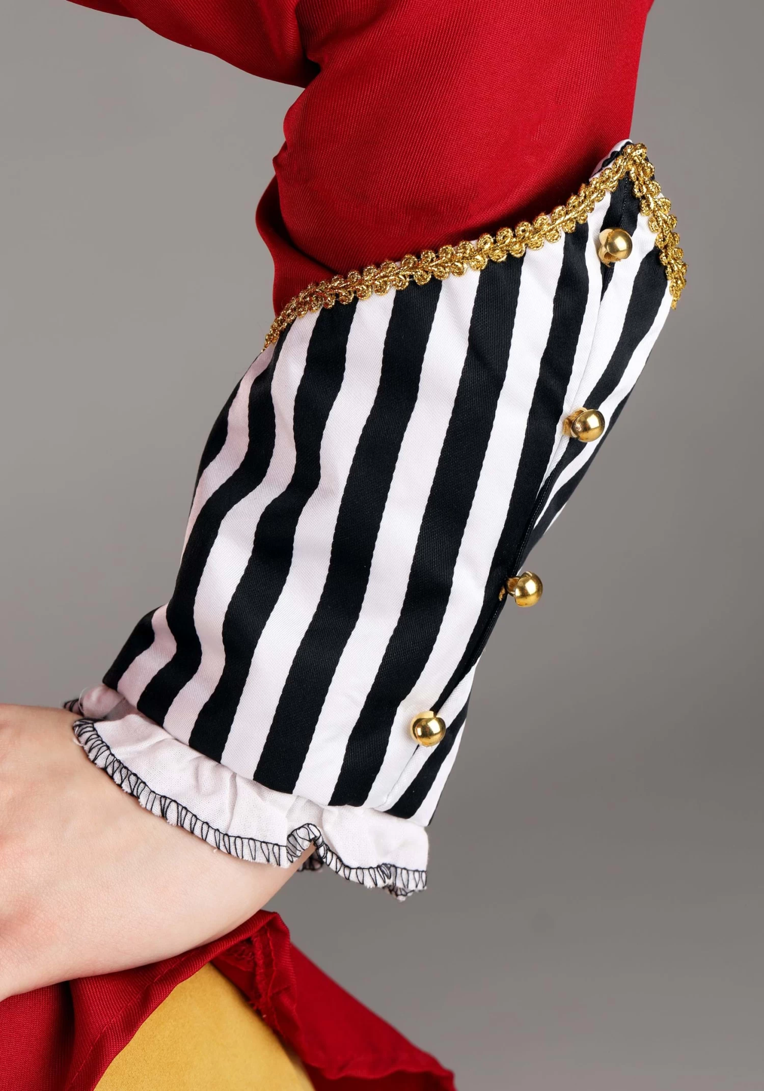 - Fitted red jacket has tassels on the shoulders striped cuff with values.