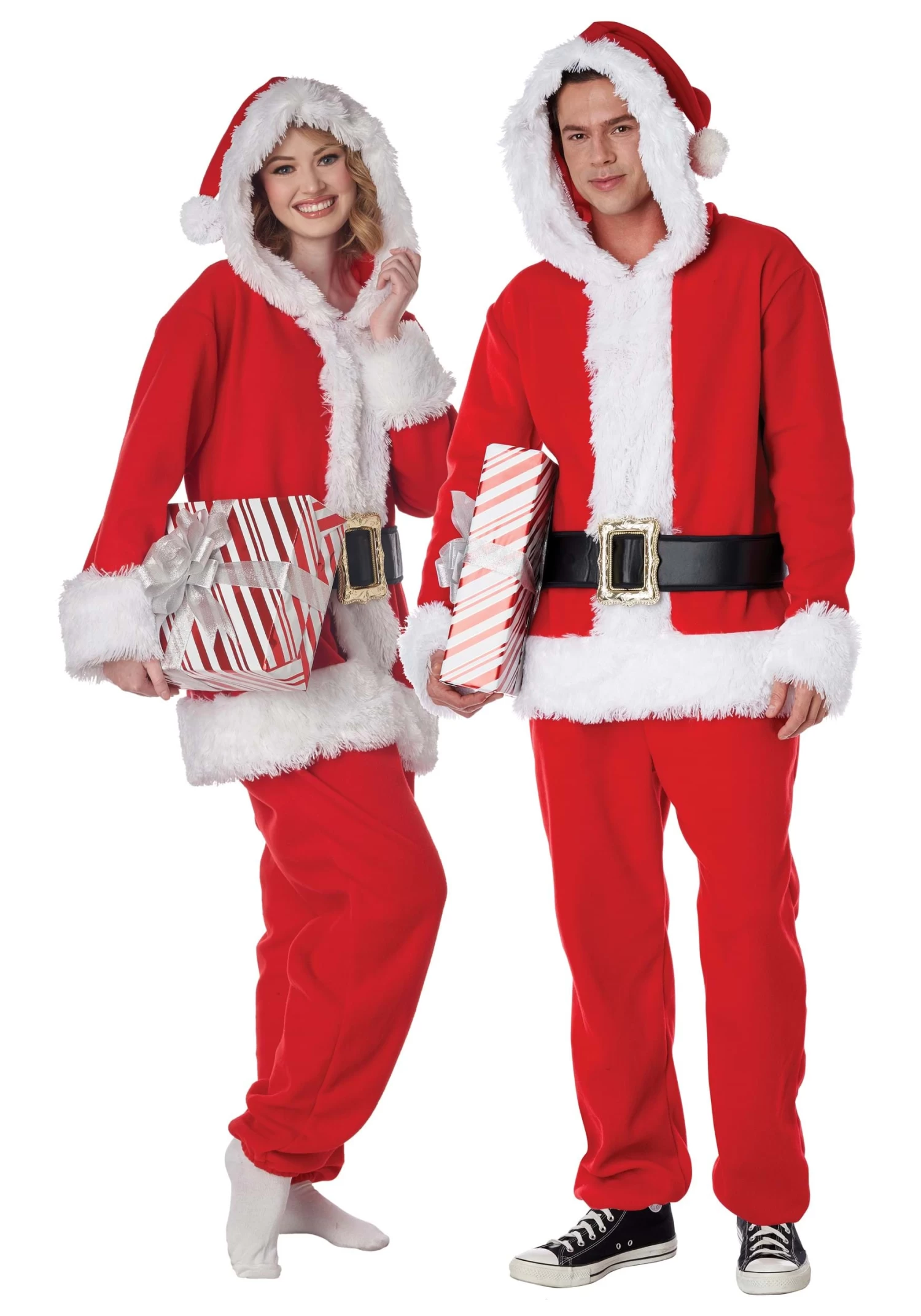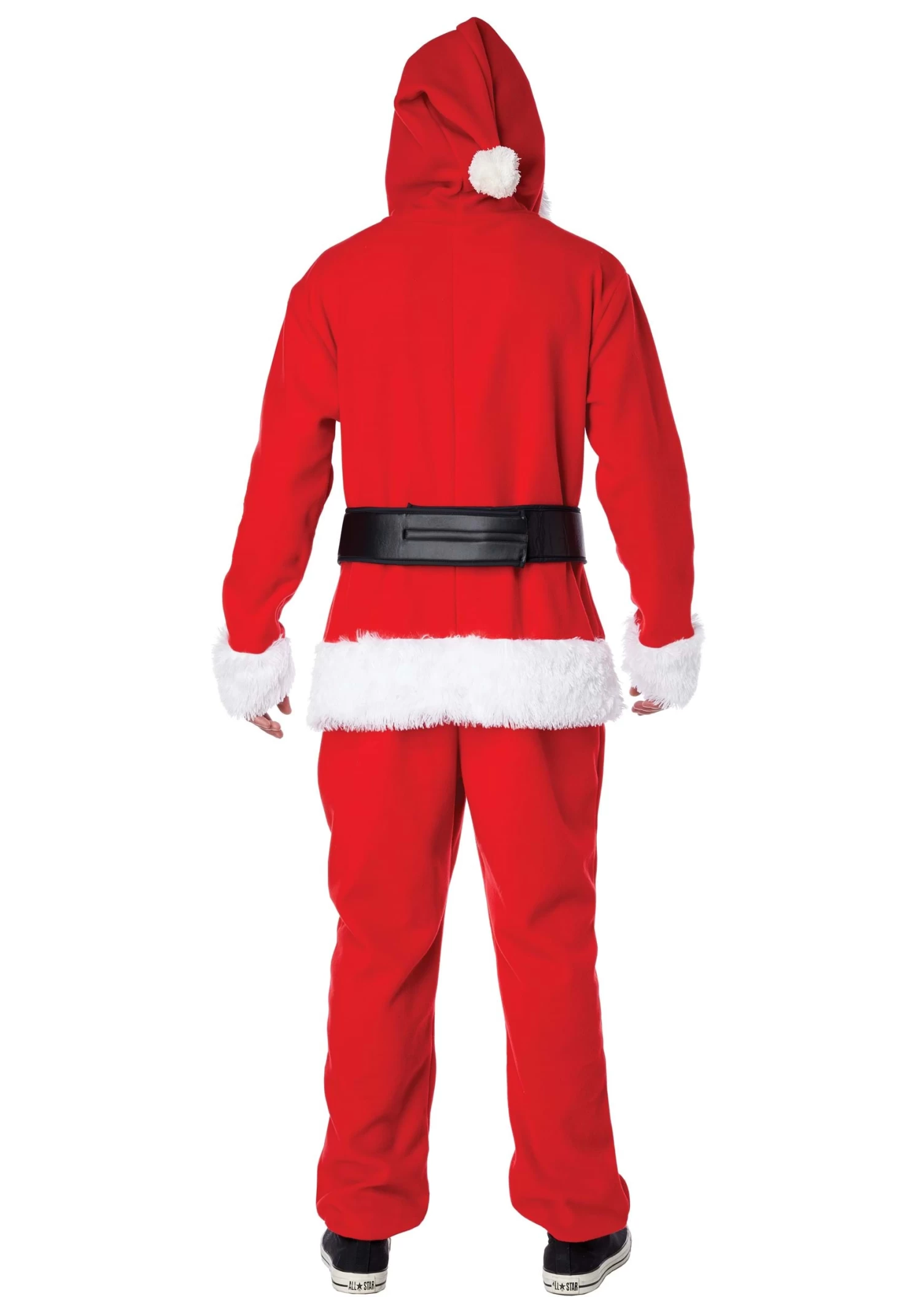 Make a list and check it twice – and then cross “Get a great costume” off of it because this unisex Santa’s Red Jumpsuit for Adults has you covered! The onesie-style outfit is made of red polyester fleece that’s as soft as magical reindeer fur (or so we hear), and is designed to look like a separate top and bottom. The jumpsuit’s upper half is lined with fluffy white faux fur around the sleeve cuffs and hips, up the front of the chest, and around the attached Santa-hat-shaped hood. The bottom half is solid red fleece with elastic in the ankles to keep your legs nice and warm. The finishing touch is a wide black belt complimented by a gold-tone plastic slide buckle that has intricate molding.