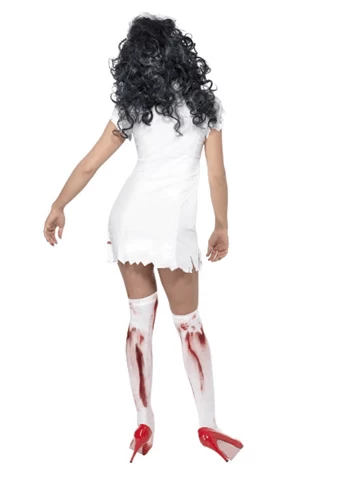 This horrific yet chic nurse costume is a great take on the classic zombie look. You’ll look like a selfless victim of the undead uprising with a blood splatter pattern throughout the bright white uniform. The dress zips up the front and has a tattered hemline and sleeve cuffs. The ensemble tops off with a Red Cross hat and a face mask. You might have been swept up in the apocalypse but at least you went down trying to help out.