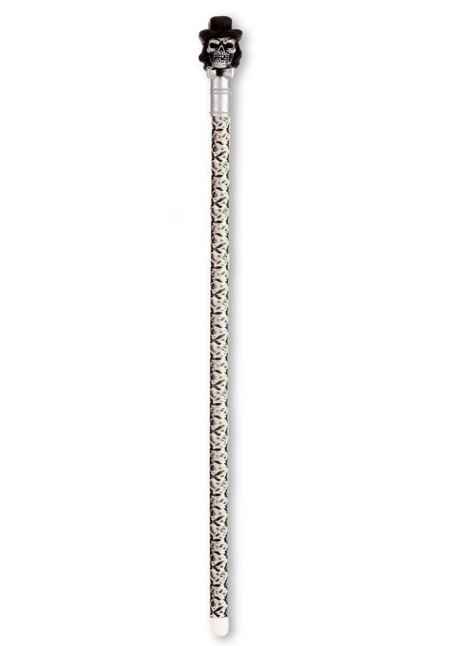 This 100% molded plastic voodoo cane seamlessly brings together style and substance. The cane stands proudly at 31″ high with its three easily assembled pieces. The shaft boasts a captivating printed snakeskin design, perfectly capturing the essence of the wild. At its pinnacle, the cane features a masterfully molded latex skull adorned with wild hair and a dapper top hat.