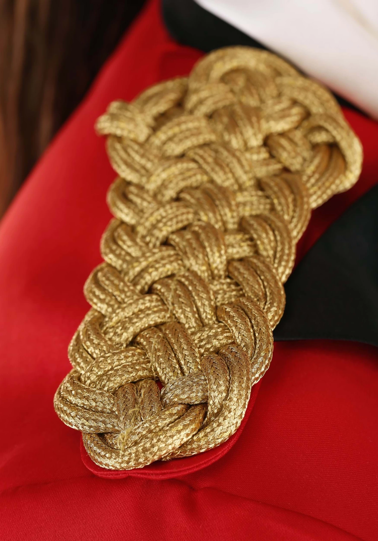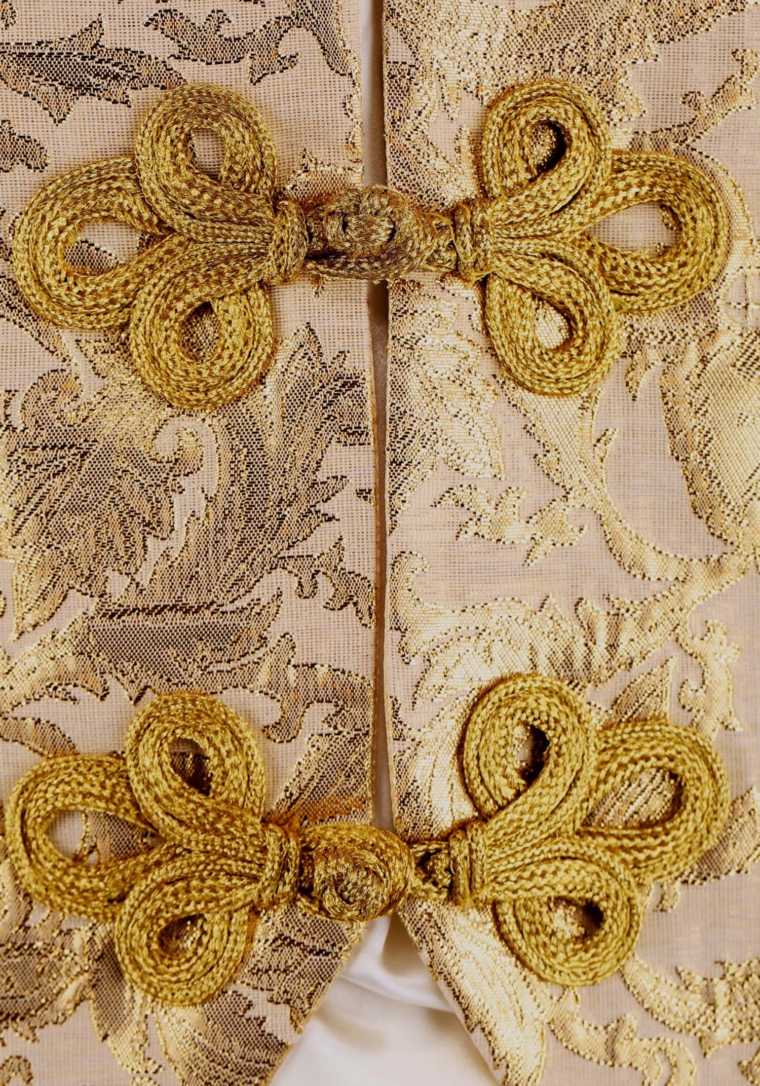 - Vest front attached to jacket has gold cording closure w/ gold swirl details