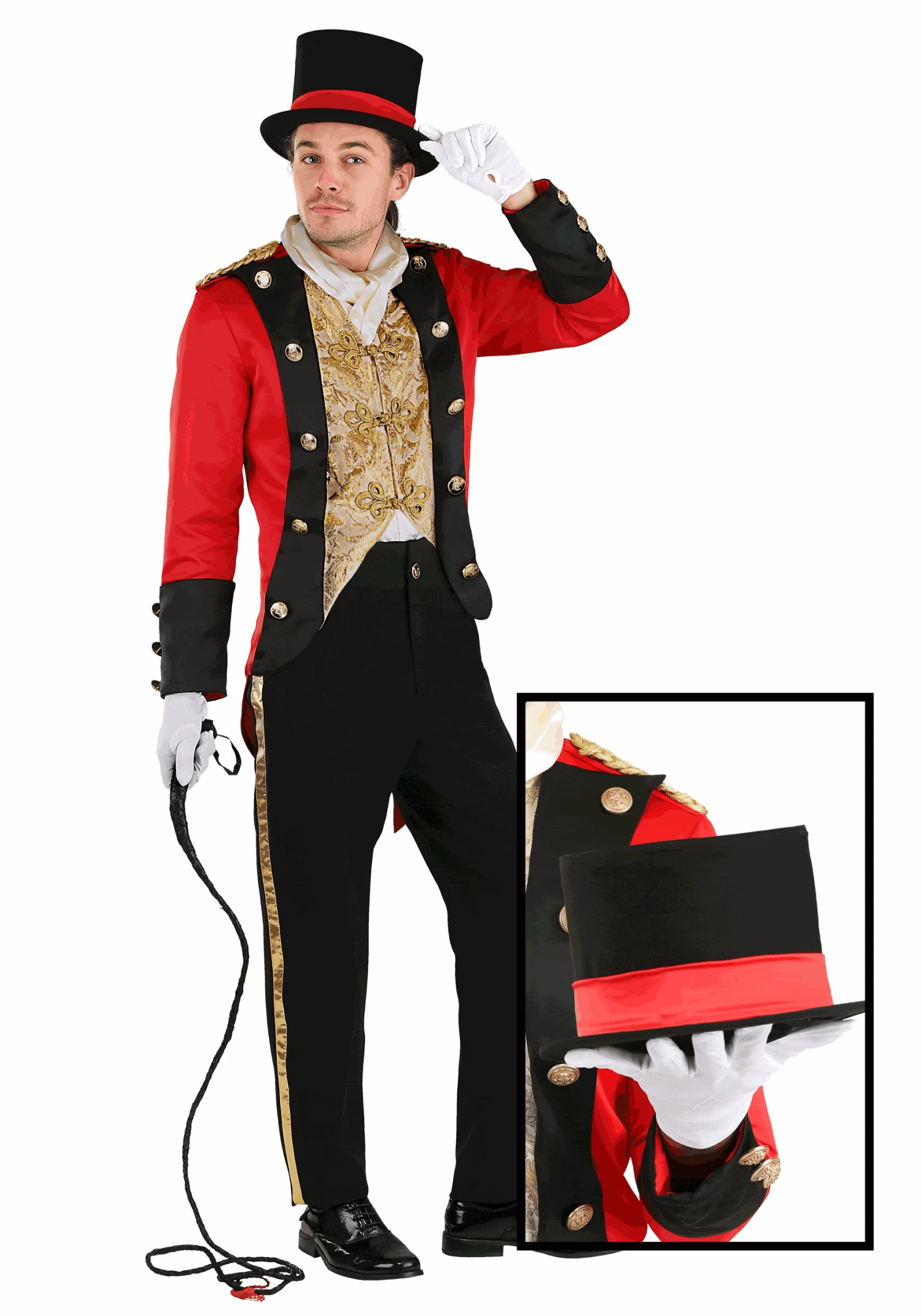 Dazzle and delight in your Spotlight Ringmaster Men’s Costume! Such an incredibly dashing entertainer needs an incredibly dashing costume, don’t you agree? We’ve got you covered. The 100 percent polyester satin red tailcoat pairs beautifully with the black trouser pants embellished with gold trim. The vest front features gold swirl brocade detail. Add the black top hat for the crowning touch (pardon our pun). Its red satin trim is as delightful as its collapsible design.