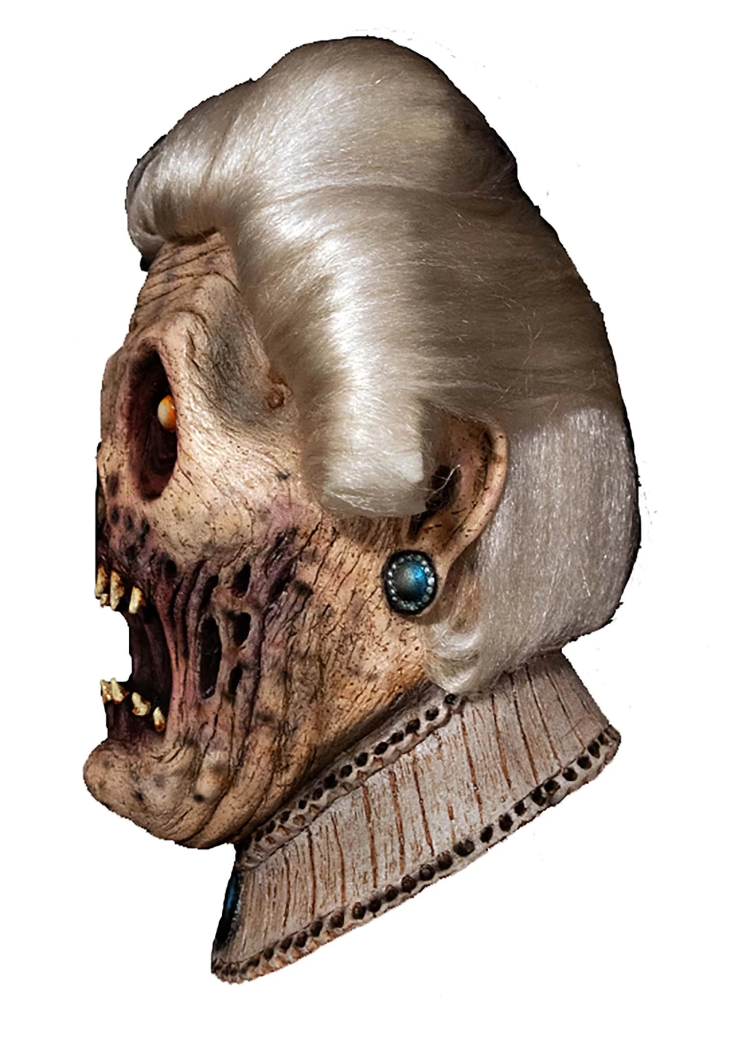 Give a new meaning to “Gothic horror” by wearing this The Duchess Zombie Mask for Adults! The realistic latex mask covers your head and neck, and is molded to look like a shrieking old woman with rotting skin, staring eyes, yellowed fants, and a skeletal nose hole. Blonde synthetic hair is attached to the mask and comes pre-styled into sausage ringlets. The throat area is designed to look like a high lace collar with a cameo.