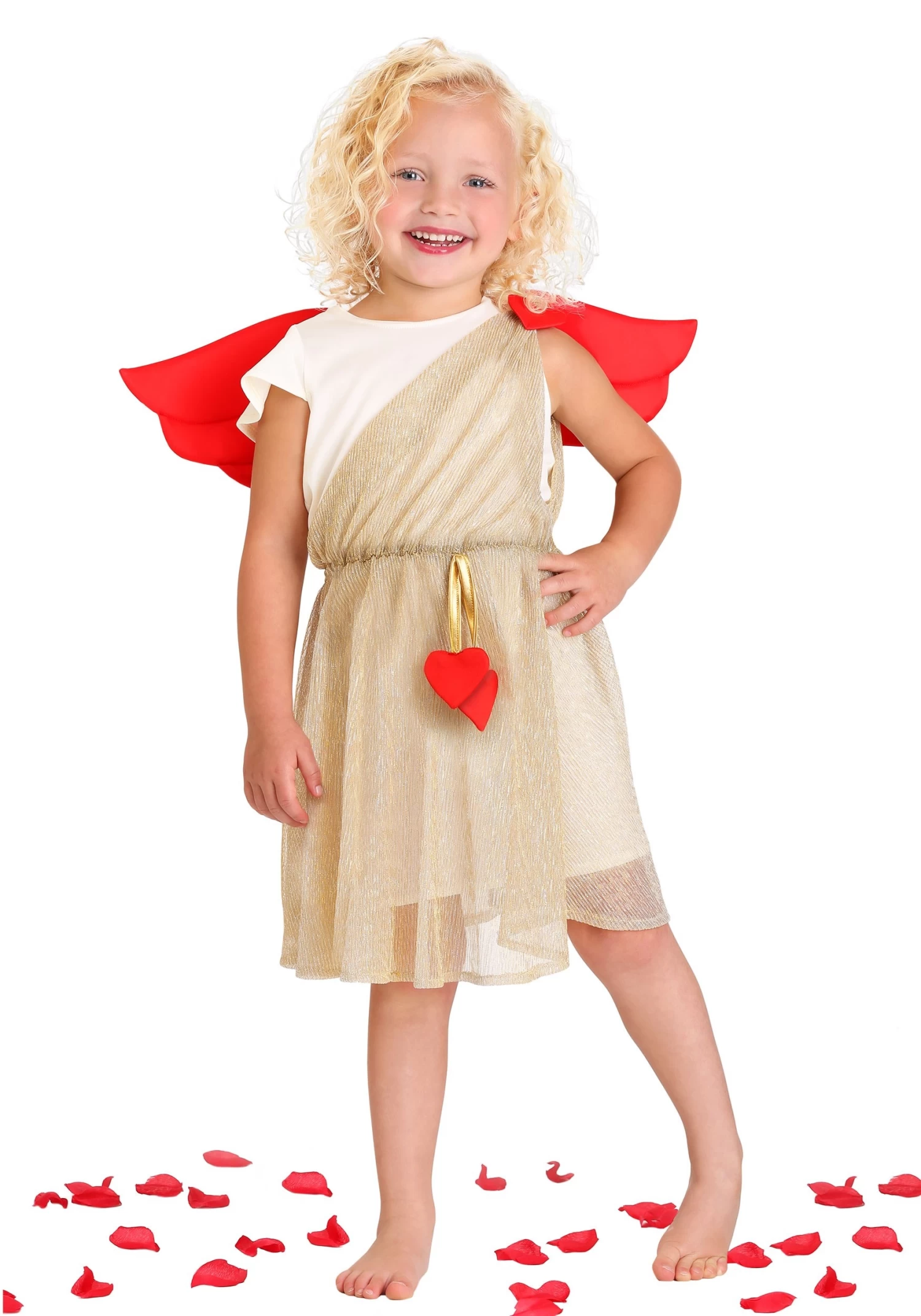 Rather than fight against a war that nobody is ever going to win, we think you’ll enjoy leaning into the sure victory of your kiddo’s cute grin while wearing this exclusive Cupid costume for toddlers. All the young lovers in the office worked together to create the most adorable angel of love look they possibly could—we didn’t let them go on their Valentines Day date until they finished! It worked great as this white jersey tunic is overlaid with the lovely golden toga. The heart-inspired wings are attached to the back of the tunic, and an attached golden braided cord functions as a belt, complete with cute felt hearts at the ends.